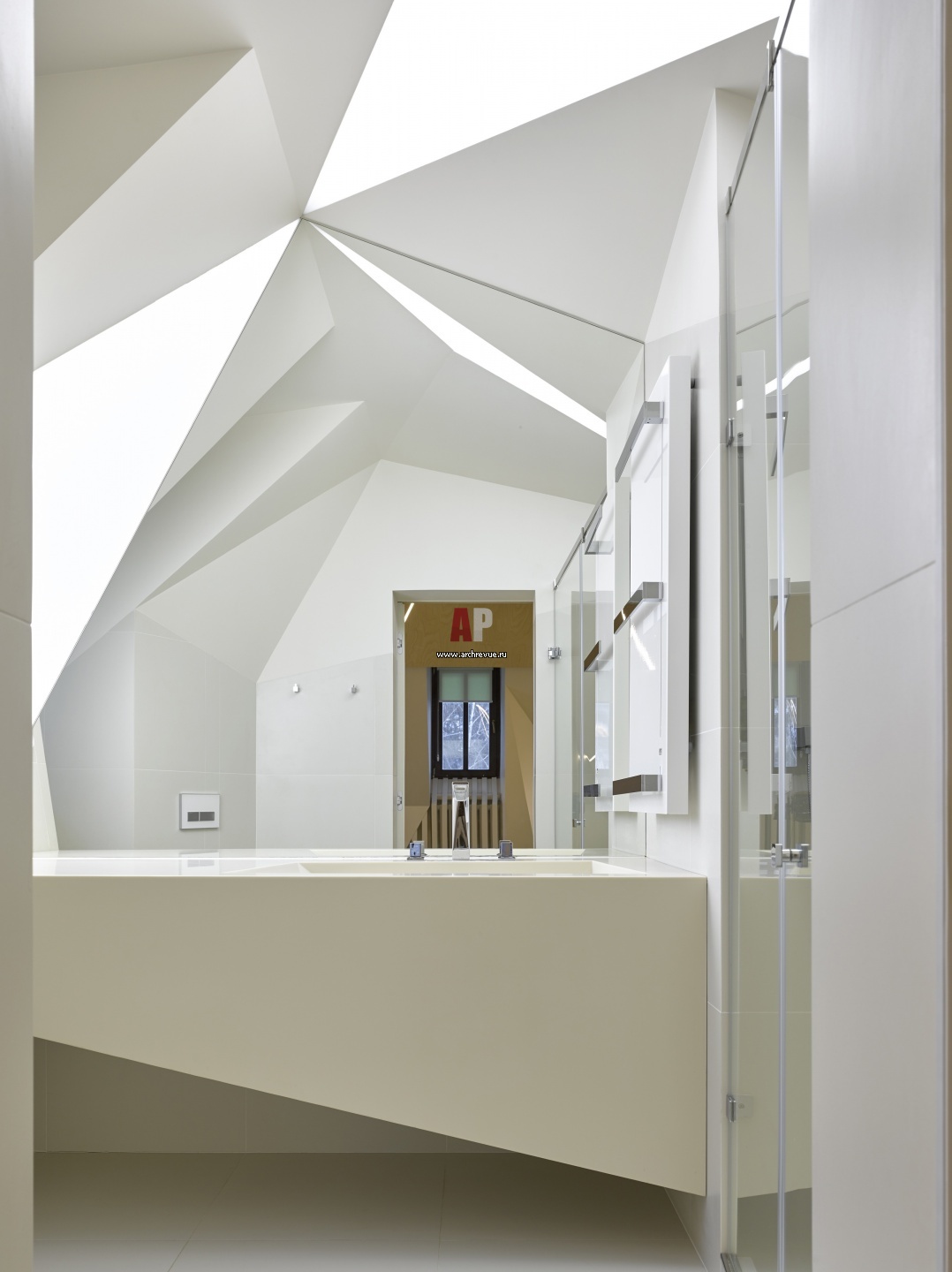 Интерьер детского санузла с ломаной геометрией. Раковина сделана из кориана. Смеситель Grohe. Полотенцесушитель Kermi.