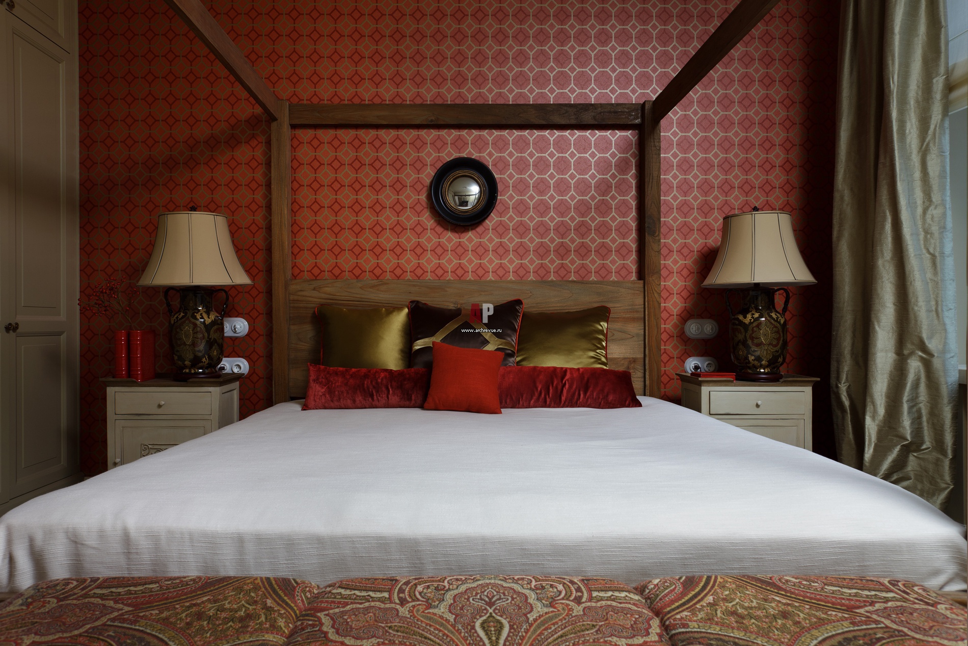 Хозяйская спальня. На стене за изголовьем кровати – обои с ярким рисунком Mulberry Home. Лепной карниз, поставщик «Петергоф». Необычная деталь — цветная полоса на гипсовом карнизе, она визуально увеличивает высоту потолка. Кровать с балдахином, поставщик TeakHouse.