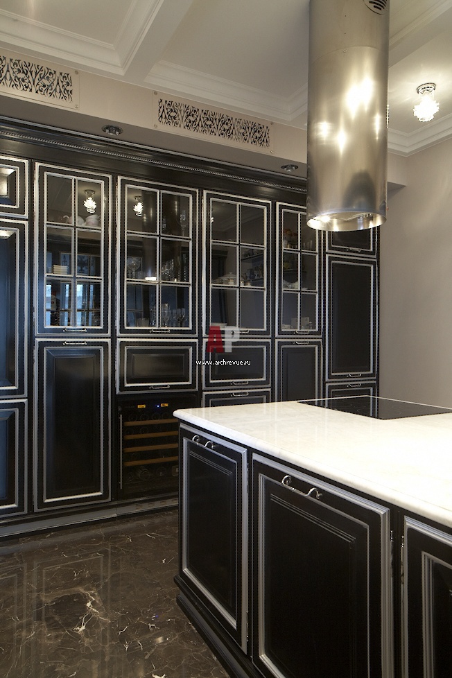 Строгая кухня в черном дереве собрана из трех разных гарнитуров. Современная вытяжка в форме цилиндра из хромированного металла.