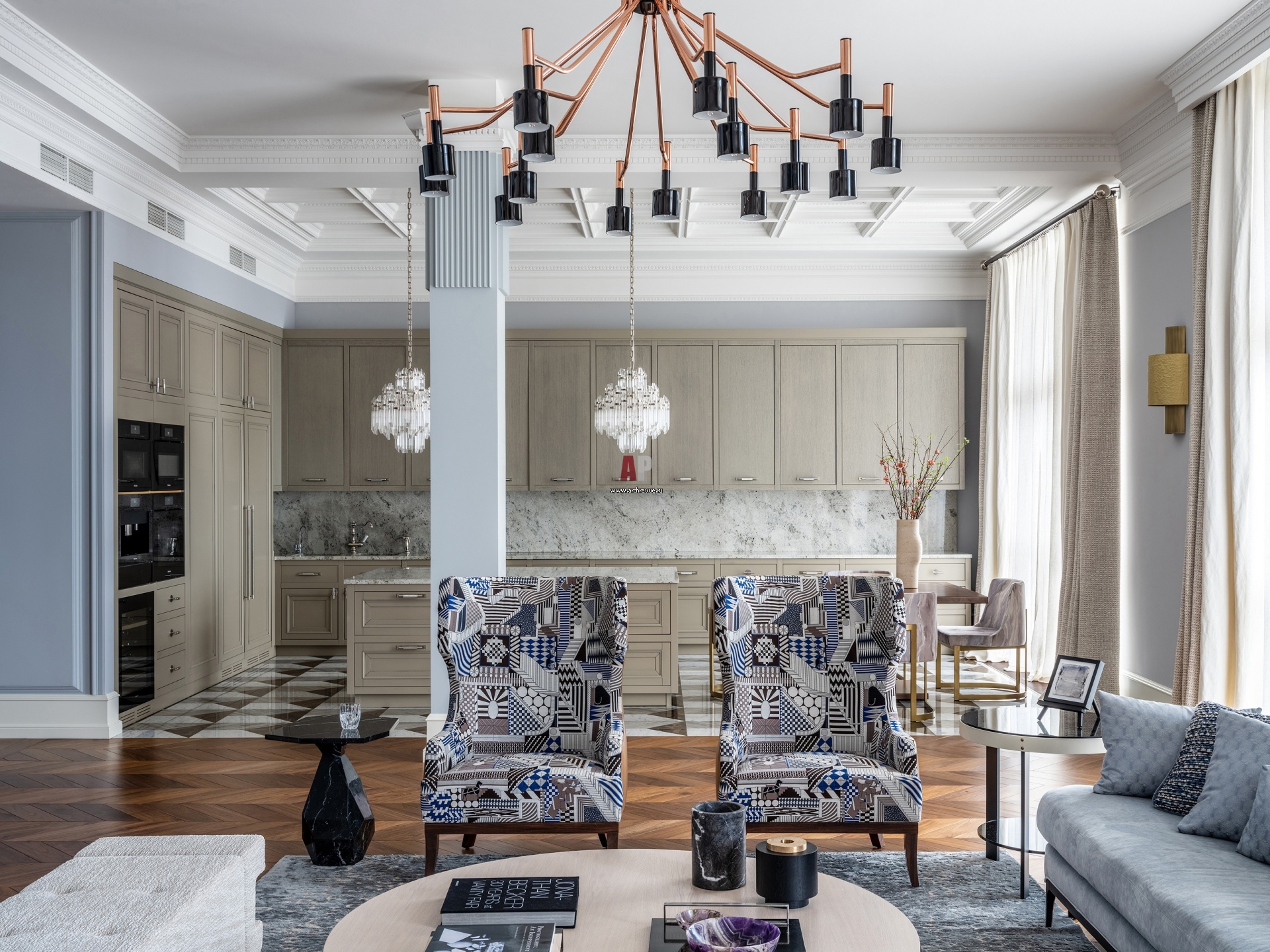 Вид из гостиной на кухню. Кресла, Munna в ткани Dedar for Hermes. Кухонная мебель сделана на заказ.