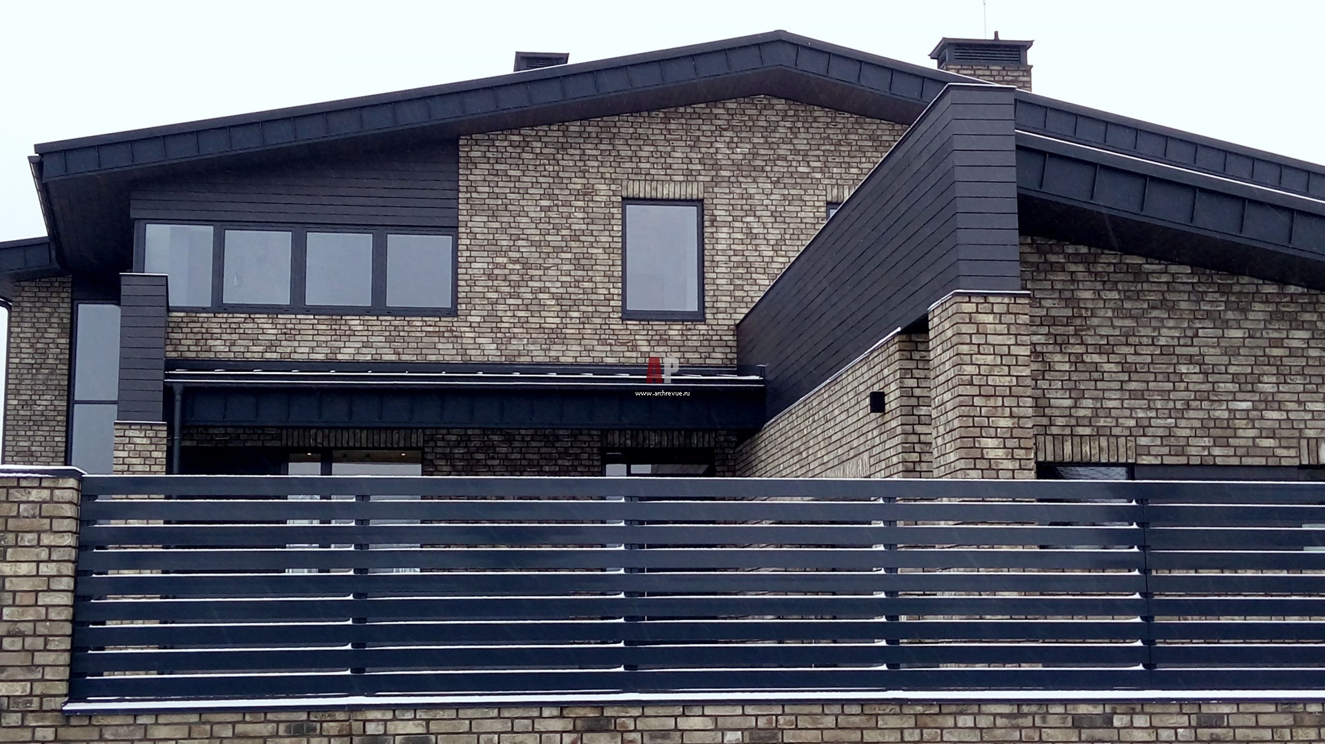 Фасад здания отделан материалами в темных тонах. Использован темный бельгийский кирпич ручной формовки Wienerberger. А также дерево, тонированное составами Remmers в угольно-черный цвет.