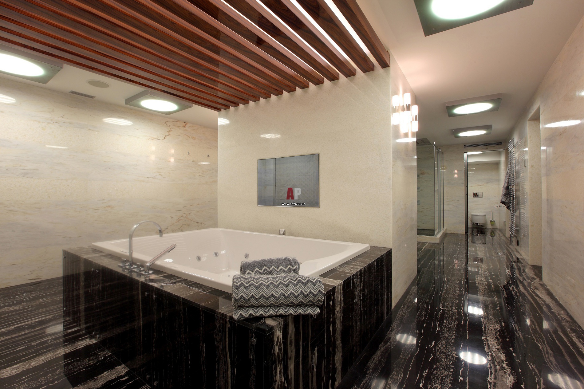 В санузле потолочные балки выполнены из палисандра, производство «АФ Ника». На полу – мрамор с живописными прожилками. Сантехника Hoesch, поставщик Konzept.