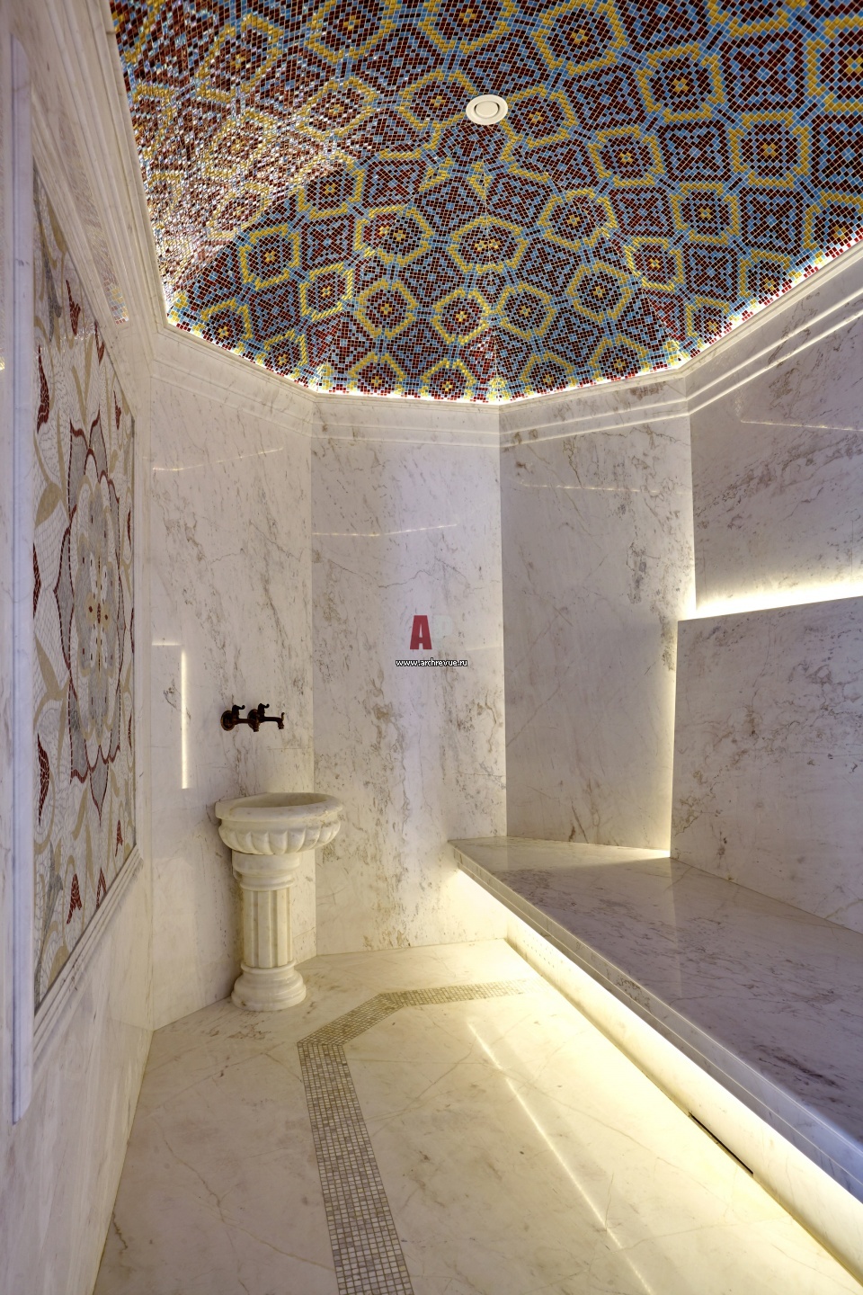 Дизайн хаммама в частном загородном доме. Настенное панно и купол, смальтовая мозаика. Курна, массив натурального мрамора. Оборудование хаммама, EOS (Германия).