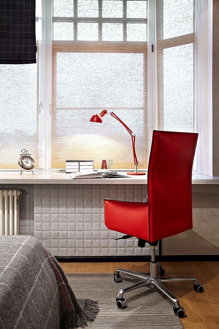 Рабочая зона в спальне. Широкий подоконник обыгран как рабочий стол. Квадратные переплеты окон придают интерьеру ритм. Интересный прием – облицовка подоконного пространства керамической плиткой metro, Diffusion Ceramique (Франция), поставщик «Грета Вульф».