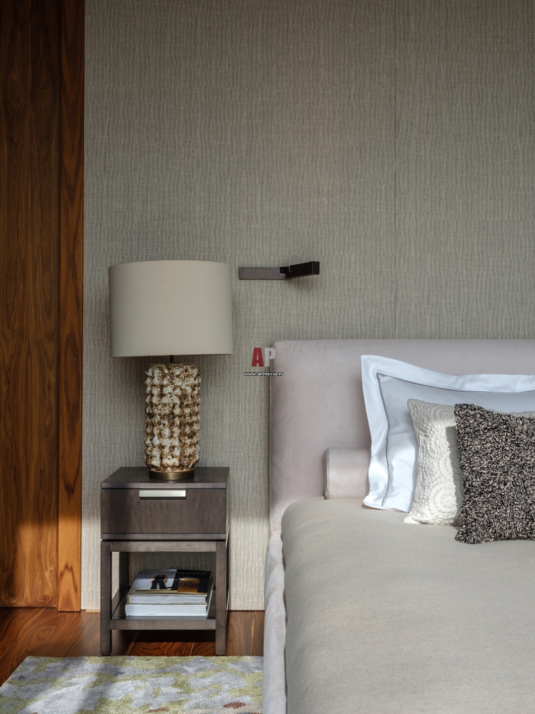Буржуазная квартира в высотке. Стены в спальне зашиты мягкими панелями в ткани Pierre Frey. Бра, Astro.