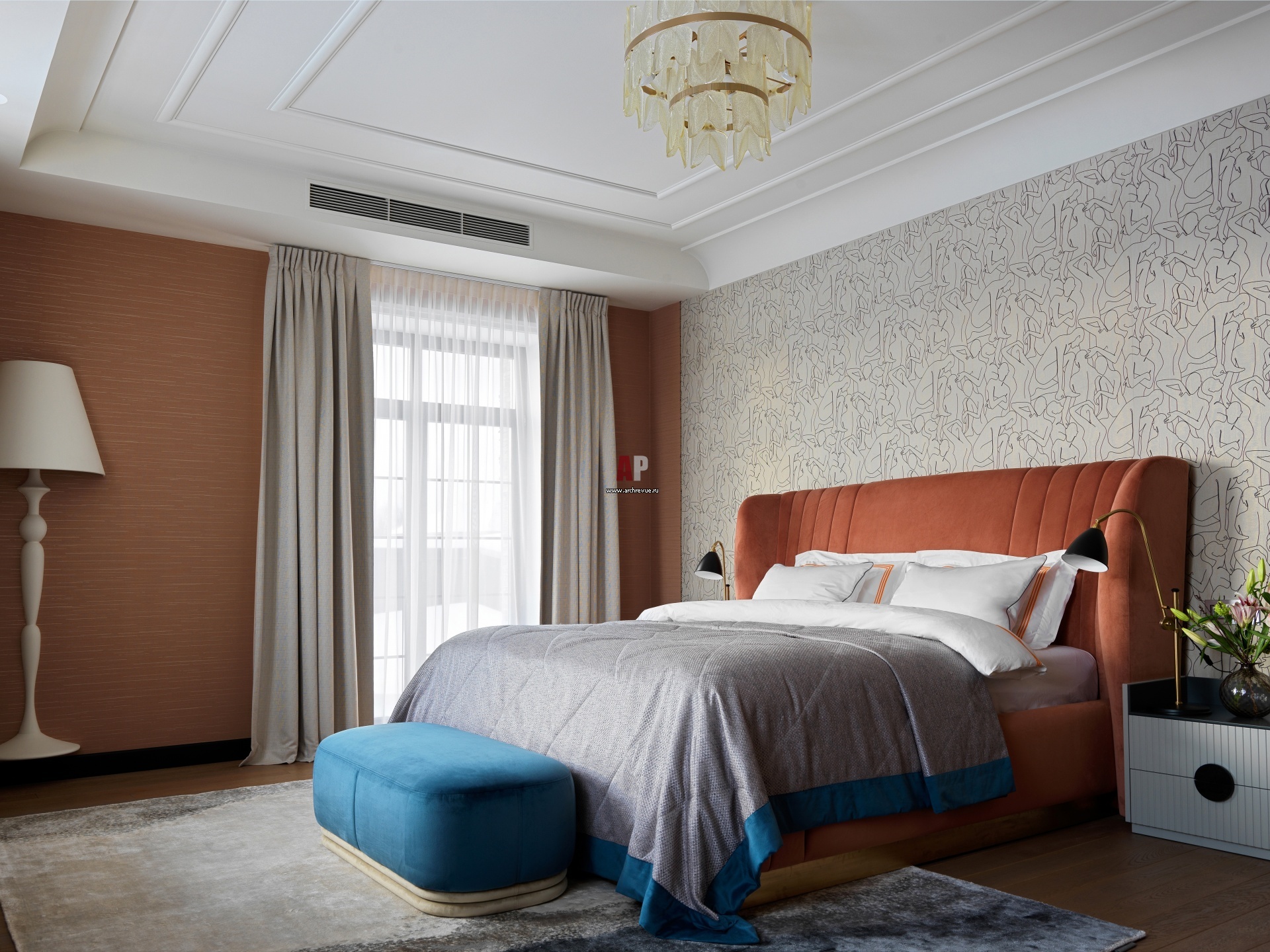Хозяйская спальня на втором этаже. Деревянный пол сохранили от прошлых владельцев. На стенах – обои, Loymina. Заказчики – люди высокие, поэтому кровать дизайнер спроектировала увеличенных размеров с высоки текстильным изголовьем. Обивка – ткань, Sanderson. Банкетку в ткани Harlequin также выполнили на заказ. Торшер, Flos. Ковер, Serge Lesage. Шторы из ткани, JAB.