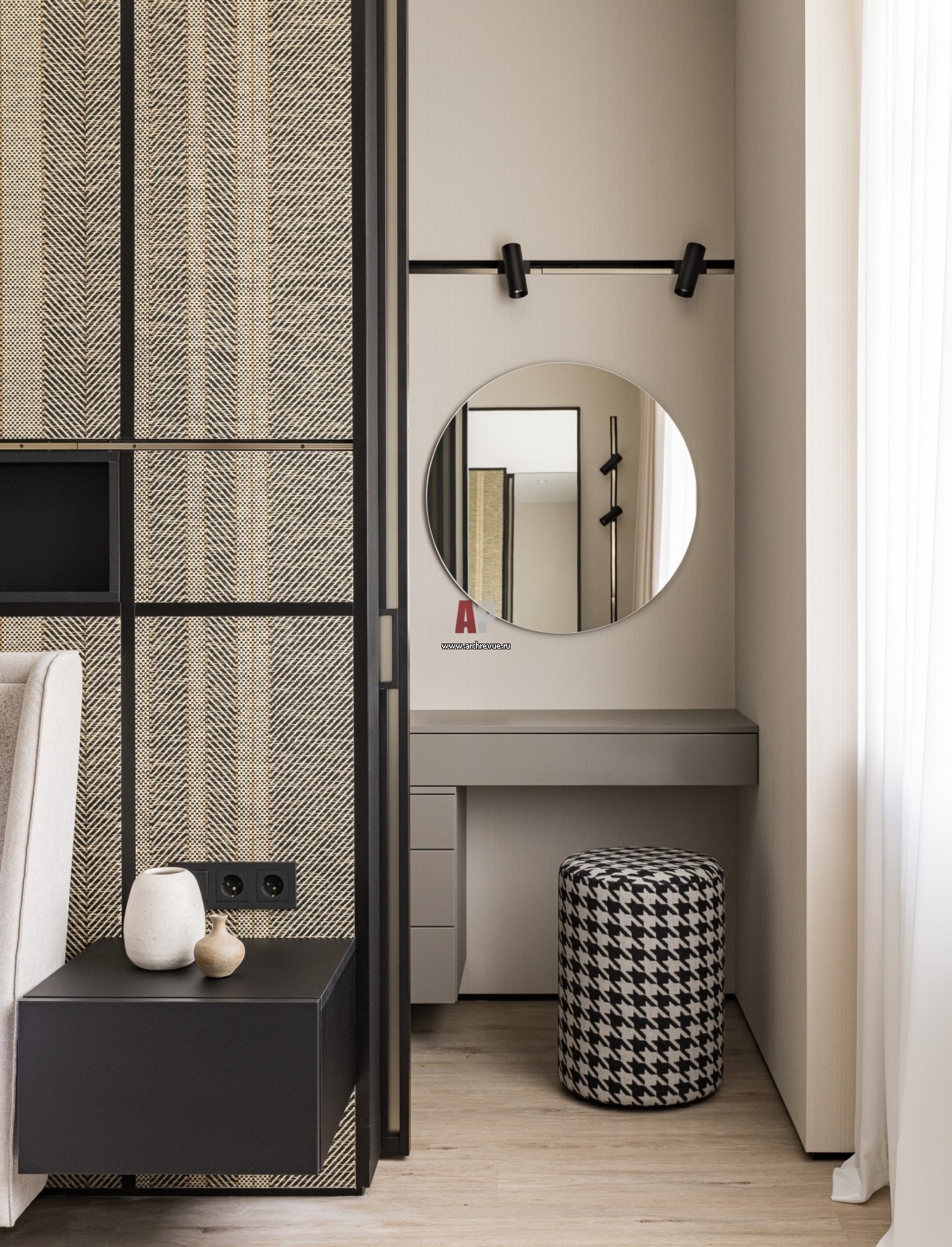 Ниша за кроватью в хозяйской спальне – достаточно сложная в плане реализации конструкция. Строители возведи перегородку с учетом толщин используемых материалов. Далее производители корпусной мебели смонтировали полку, потом строители заложили трековые светильники, а только после всех работ перешли к монтажу обоев и профилей.