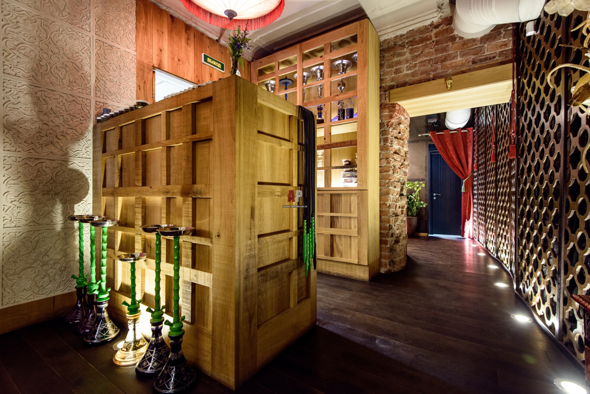 Интерьер кафе с кальянной. Стойка хостес выполнена из некрашеного дерева. Справа – перегородки из перфорированной фанеры.