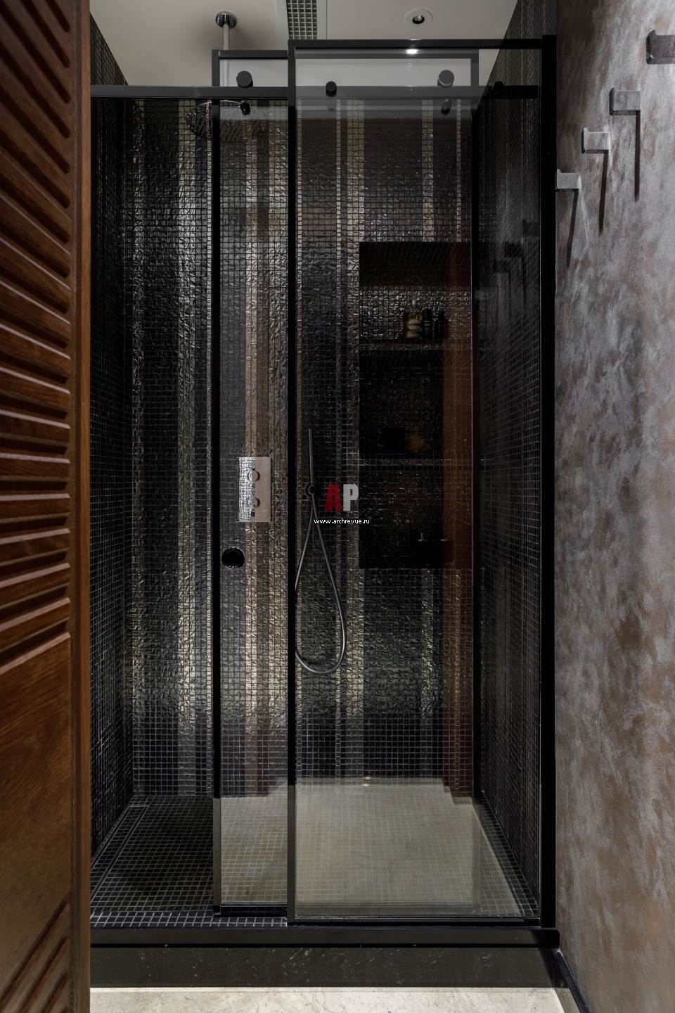 Душевая в хозяйском санузле выделена серебристой мозаикой. Она разложена на полосы так, чтобы рисунок смотрелся наиболее выигрышно.