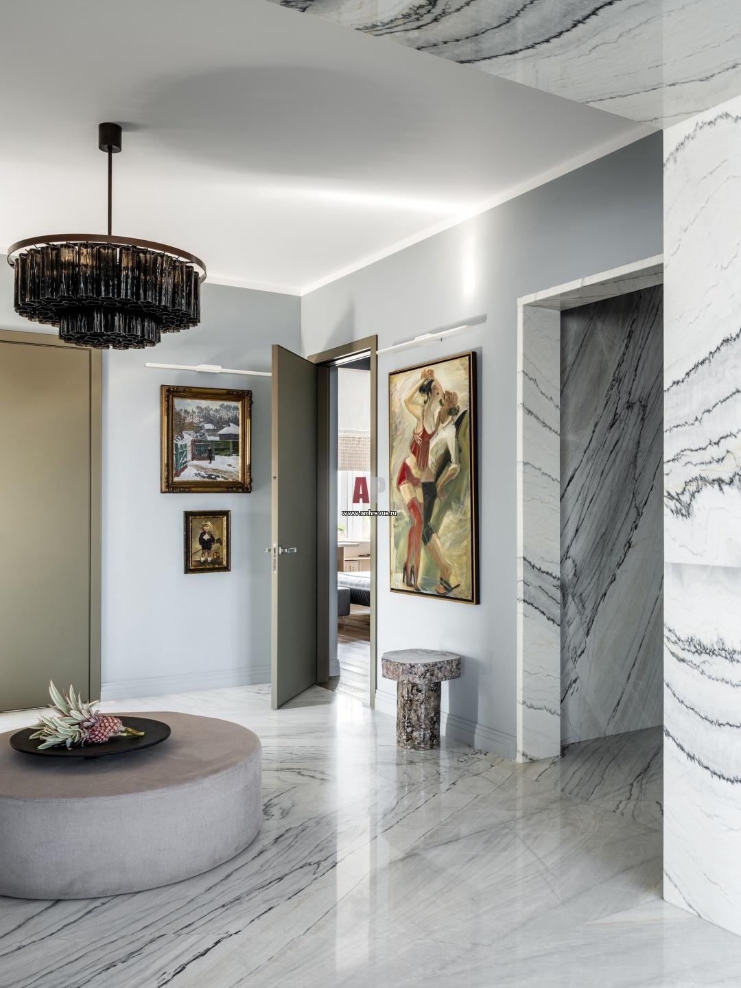 Холл. Пол, одна стена и откосы облицованы голубым иранским мрамором. Люстра, Bella Figura.
