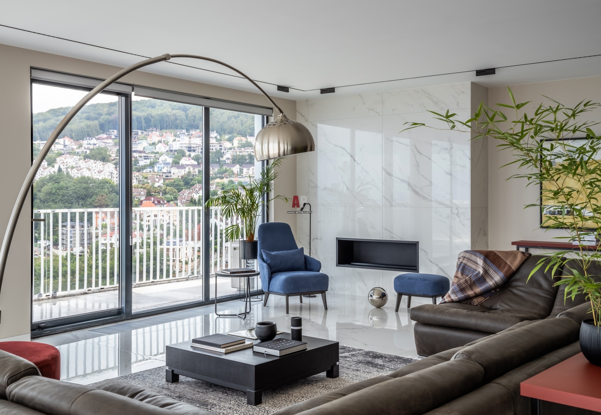 Курортная квартира в Сочи для трех поколений семьи. Интерьер гостиной с современным камином. Свет, Vibia.
