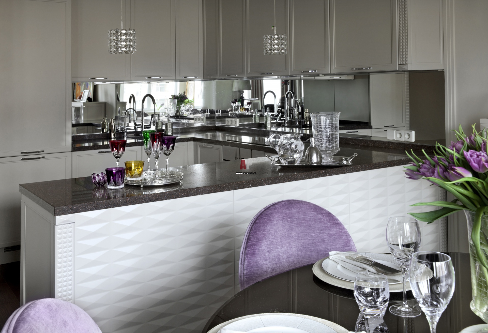 Белая кухня в стиле ар-деко с барной зоной. Фасады кухни Aster Cucine (коллекция Luxury Glam) оформлены глянцевым ромбовидным рельефом.