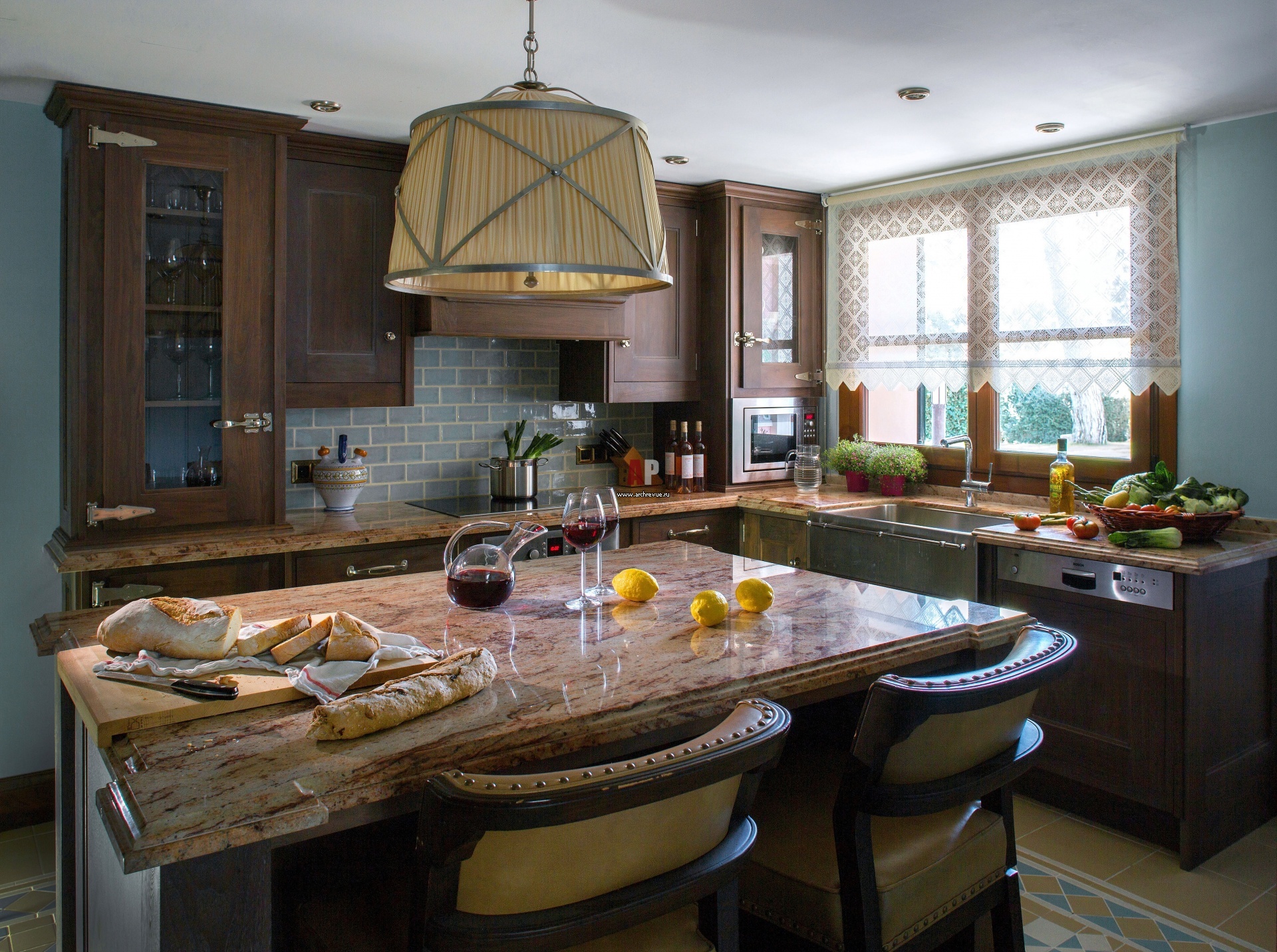 Пол на кухне облицован португальской плиткой с геометрическим рисунком. Кухня с островом Christopher Peacock выполнена из ореха с седым оттенком и оформлена массивными никелированными петлями.