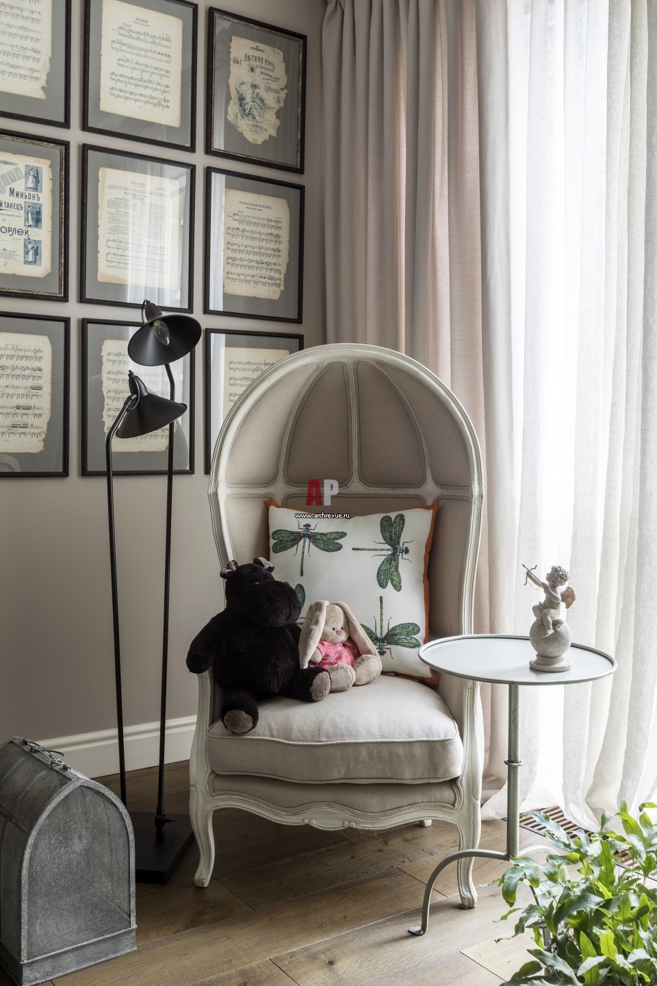 Интерьер детской комнаты в серо-дымчатых тонах. Возле кресла на стене – панно из старинных нот.