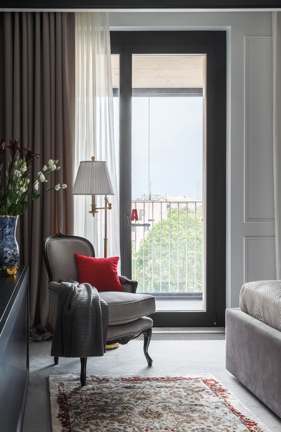 Зона отдыха в спальне. В спальне деревянные оконные рамы резко контрастировали с темно-серым плинтусом и карнизом, их пришлось перекрашивать. Кресло, столик, лампа, Ralph Lauren.