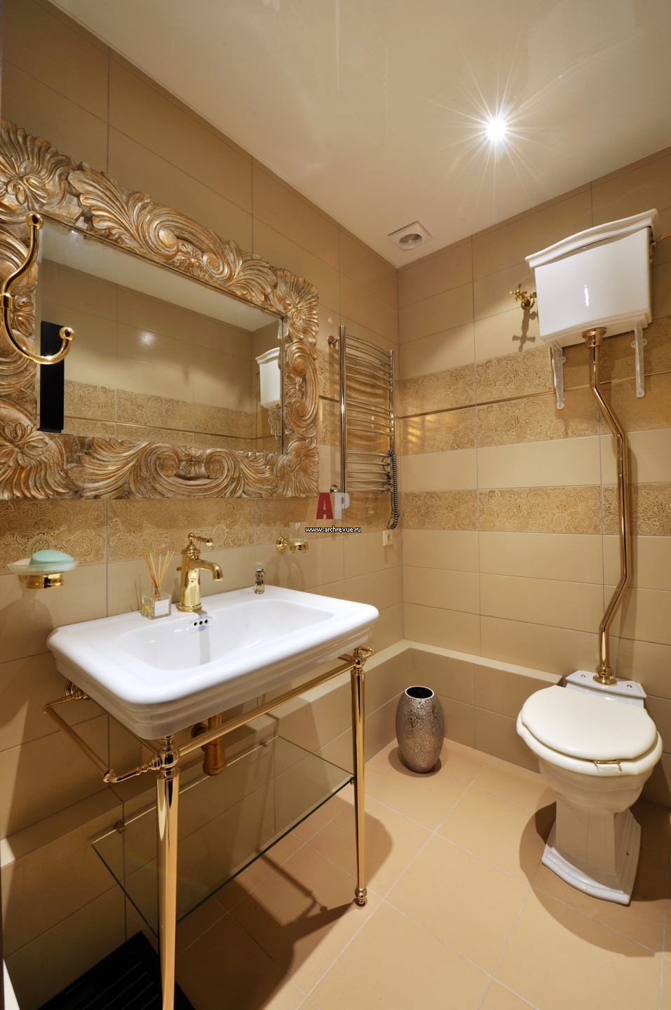 Гостевой санузел расположен у входа в квартиру. Он исполнен в бежевых тонах.