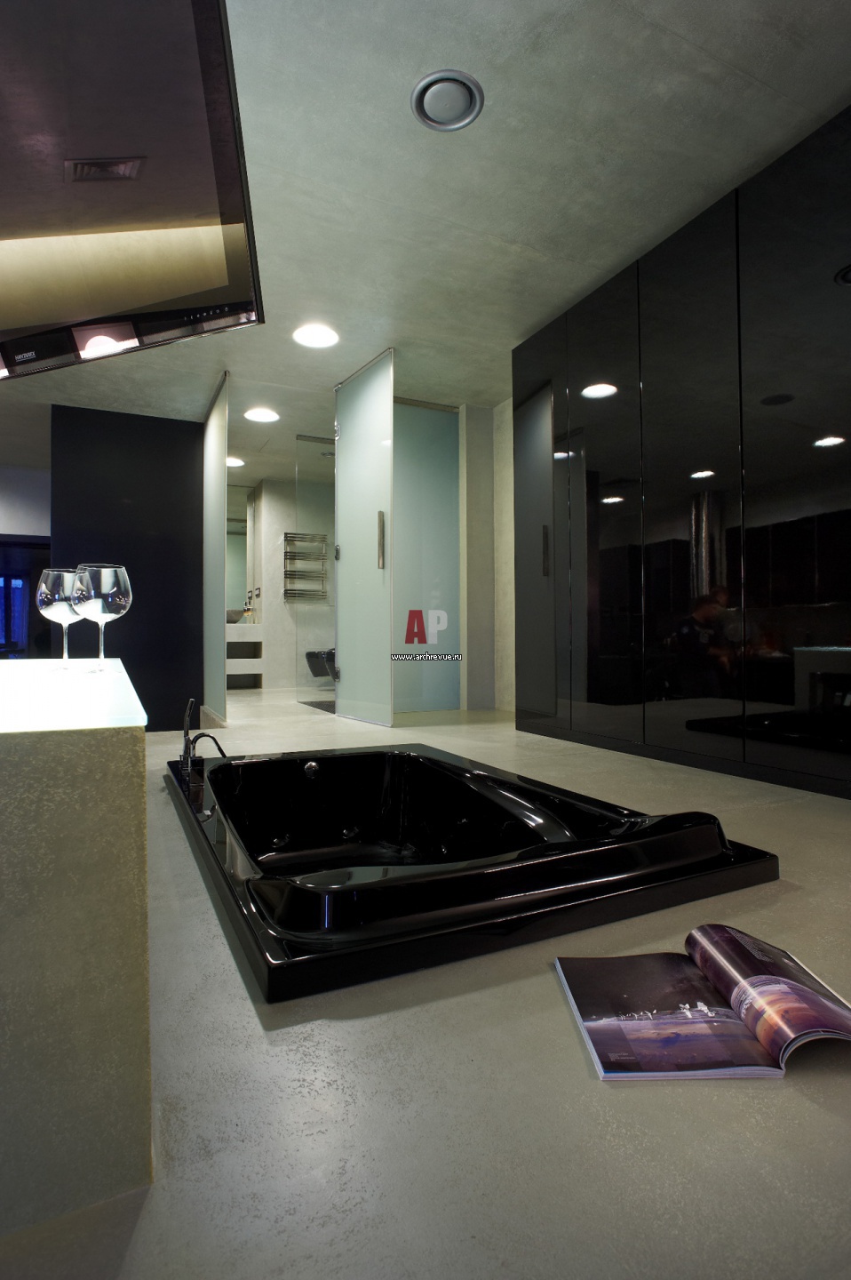 Вид от ванны в полу на санузел. Блок санузла выделен стеклянными перегородками АМG-Glass, «умное стекло» (с возможностью матирования).