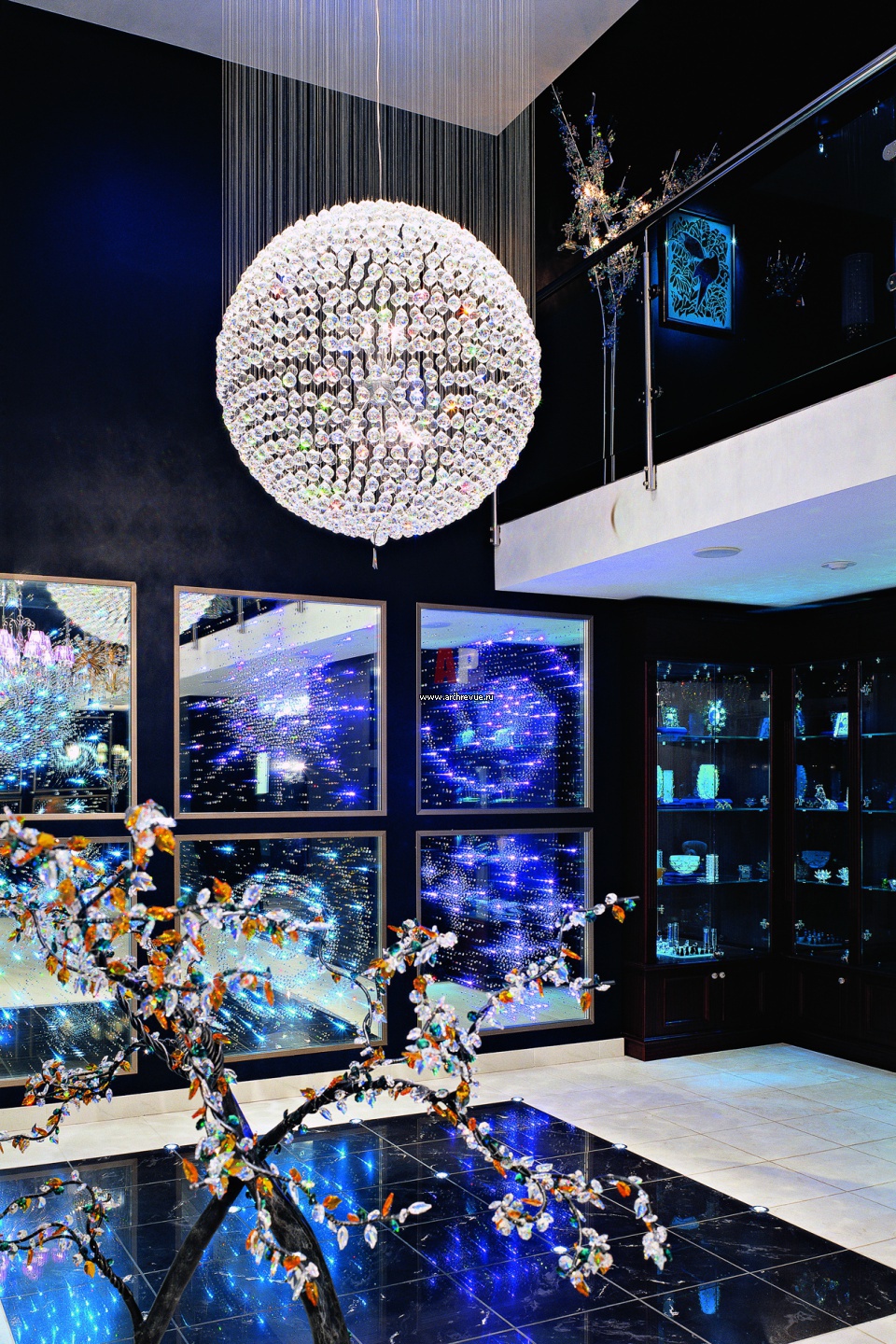 Усыпанные стразами деревья из латуни выполнены на заказ на фабрике Swarovski. Полы решены на контрасте белого и черного глянцевого керамогранита, поставщик BARS RED.