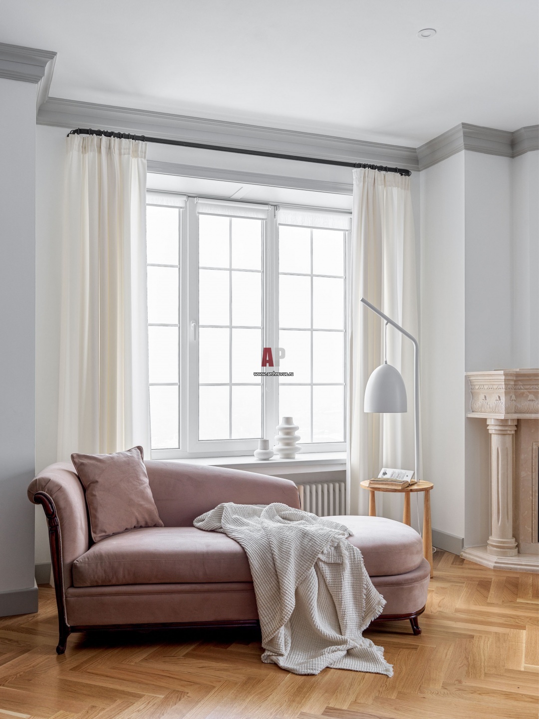 Интерьер гостиной. Окна размещена козетка, дизайнеры ее отреставрировали и обтянули розовой тканью. Торшер, Ideal Lux.
