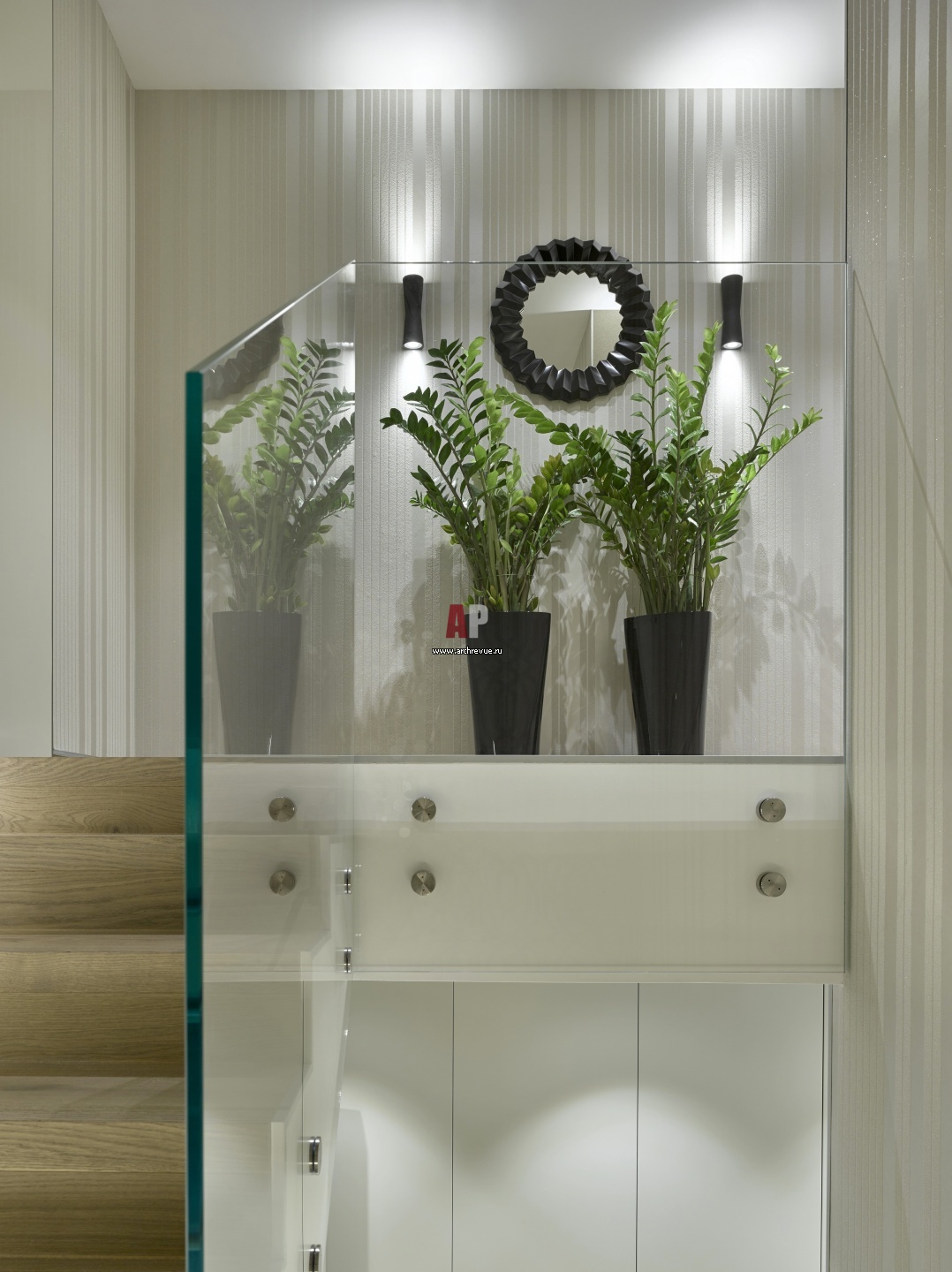 Холл второго этажа. Ограждение лестницы выполнены из прозрачного стекла, стеклянные панели крепятся на металлических болтах. Бра, Flos.