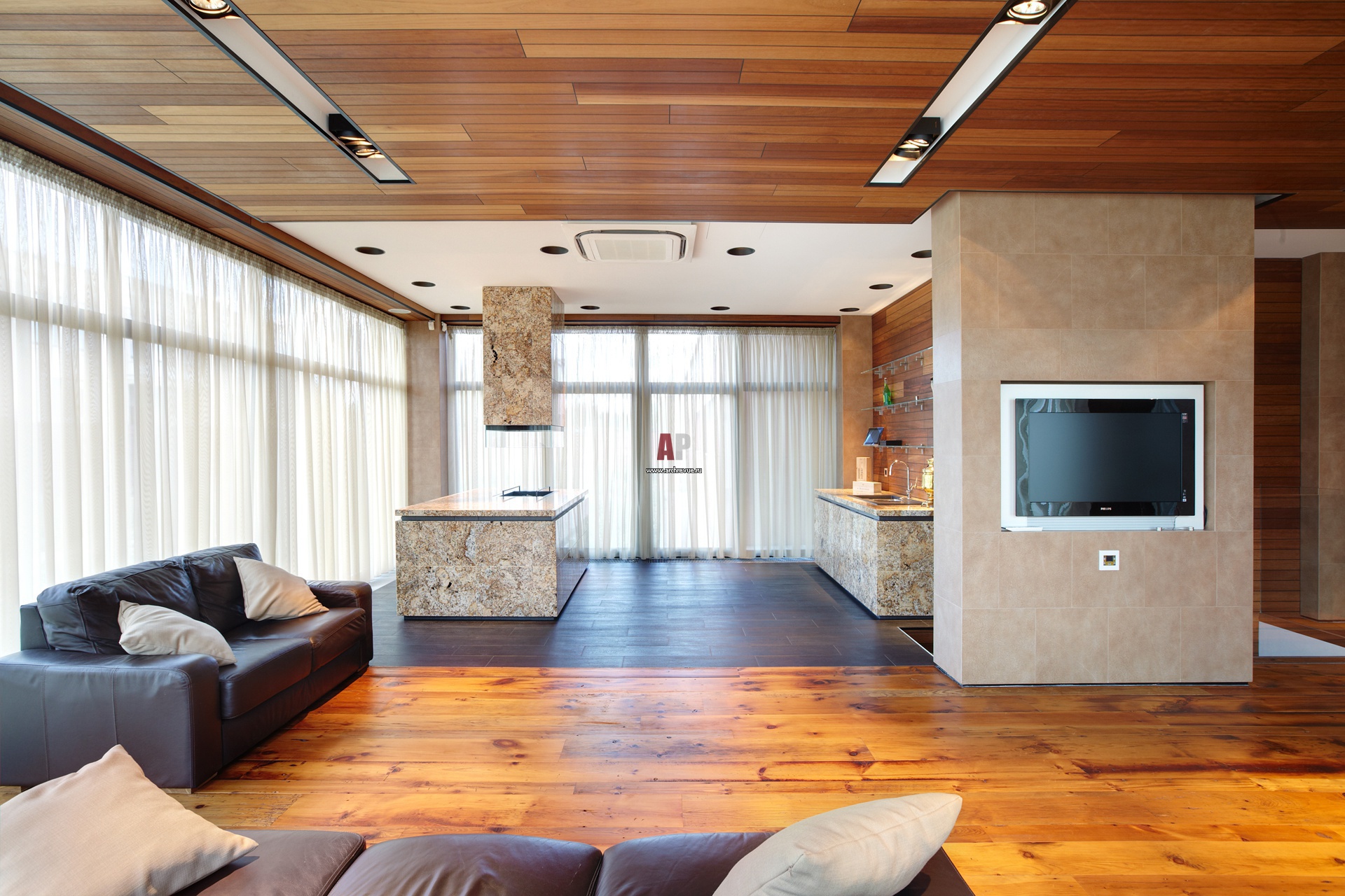 Интерьер зоны отдыха первого этажа. Архитекторам удалось сохранить ощущение простора, свободы и света за счет свободного зонирования и декоративного решения полов, стен и потолков большими плоскостями.