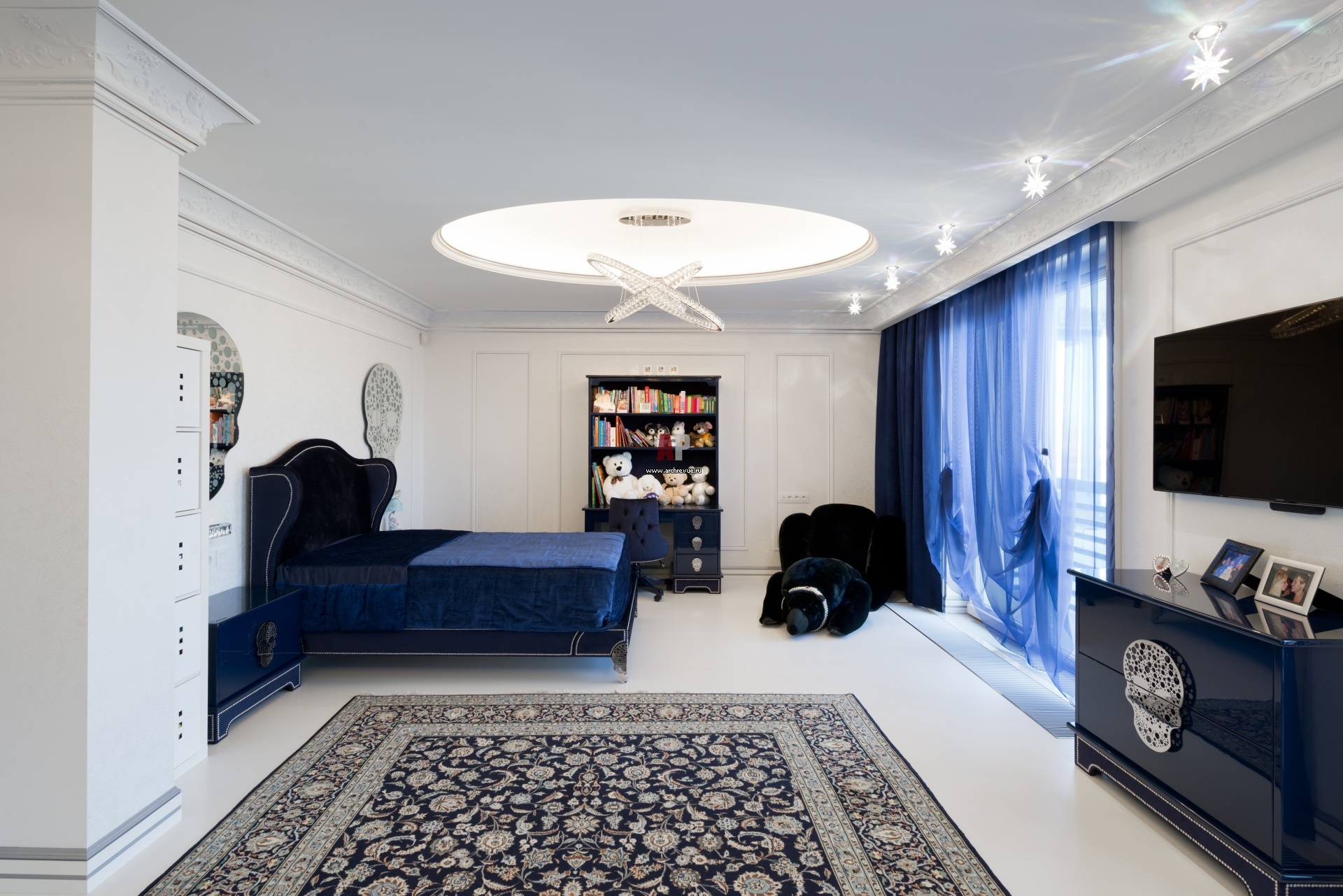 Интерьер детской комнаты сына также выдержан в белой классике с темными синими акцентами.
