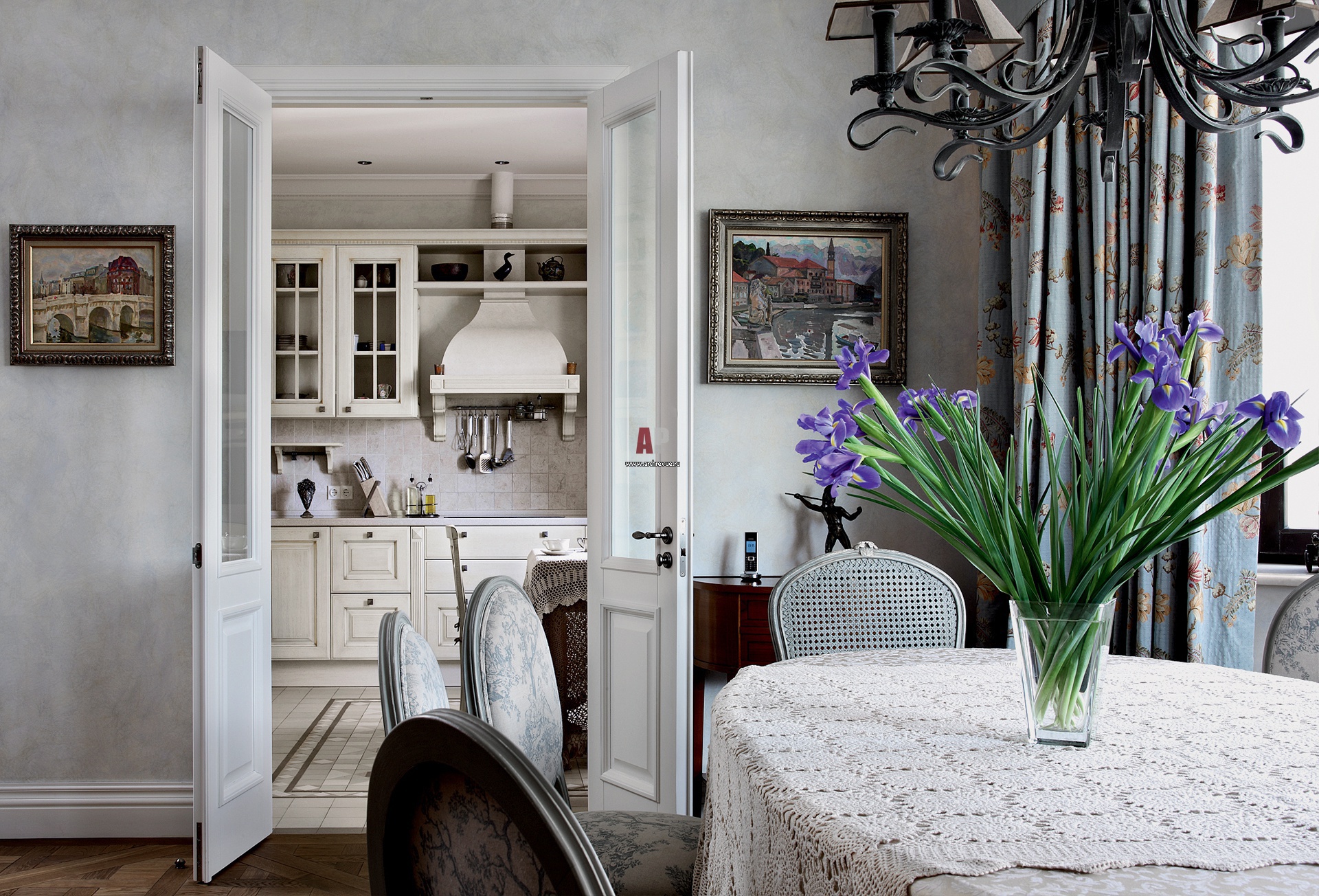 Вид со стороны столовой на кухню. Кухонный гарнитур Berloni с фасадами из белого дерева выполнен в стиле французской классики. Распашные двери с прозрачными витражами, лаконичные порталы дверей и высокие плинтуса сделаны из дерева, выкрашенного в белый цвет.