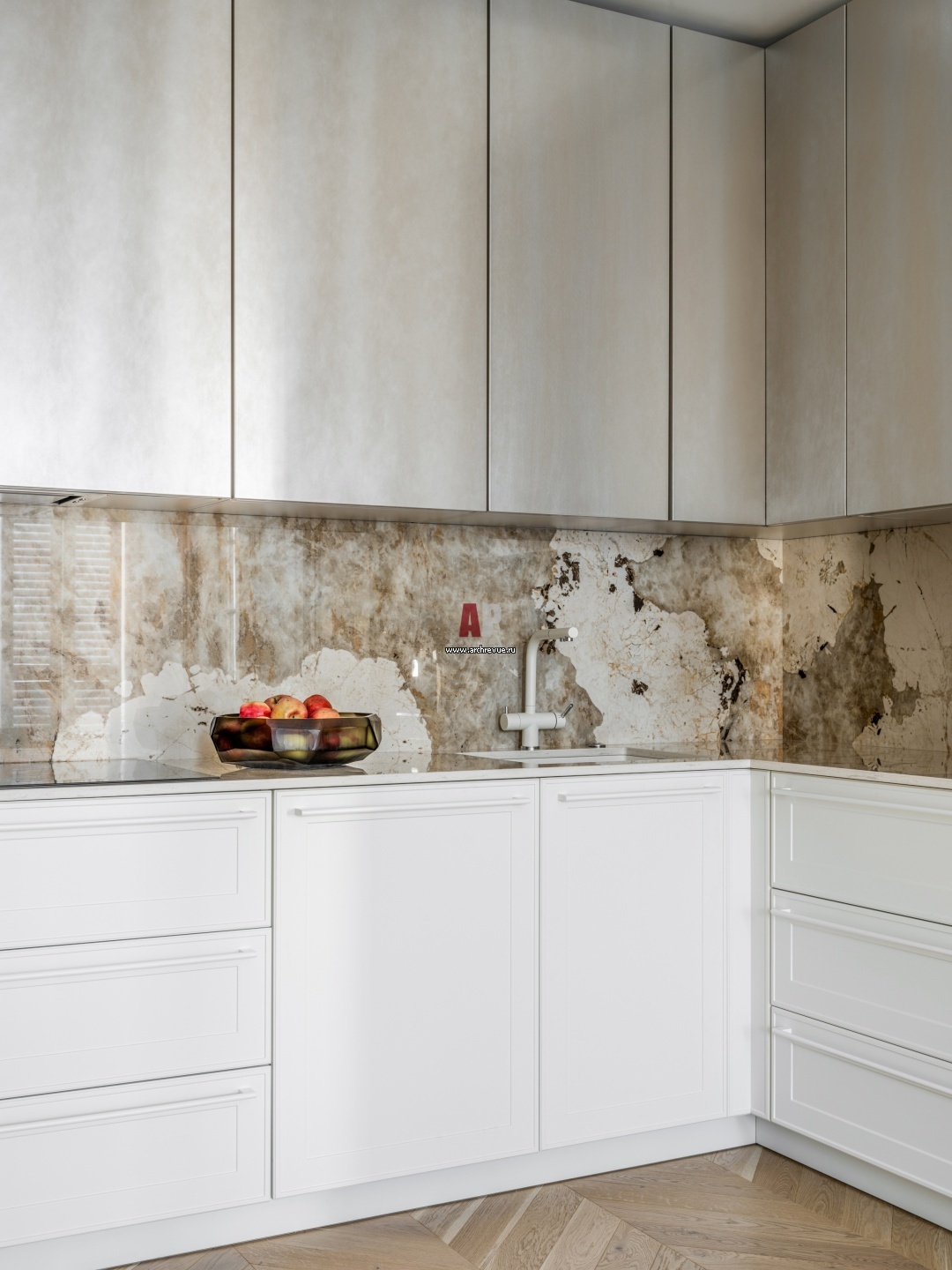 Фасады кухни светлые, с нейтральной фактурой. С ними контрастирует активный фартук из камня.
