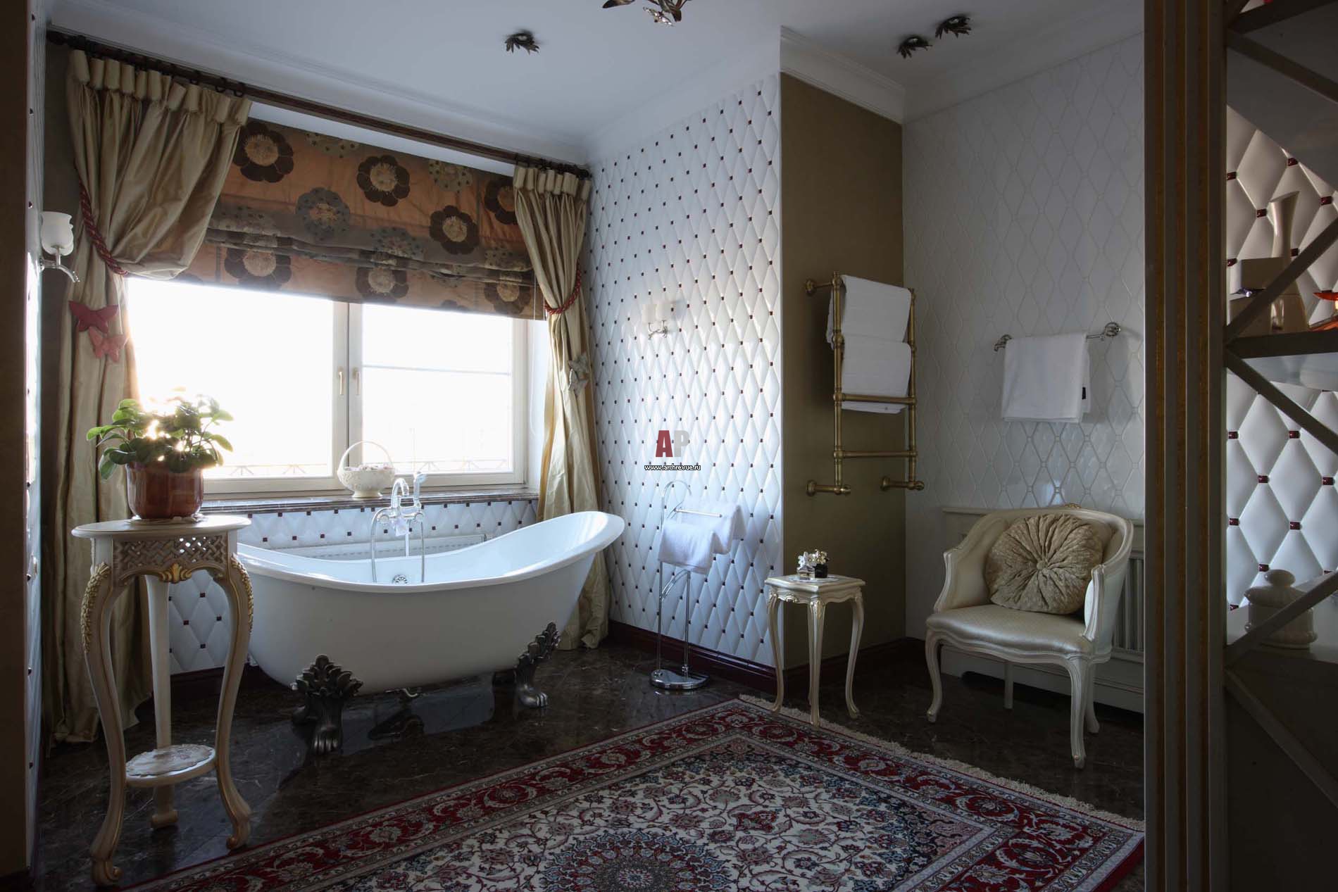 Ванная комната хозяйки напоминает будуар. Стены отделаны объемной плиткой, напоминающей обивку «капитоне». Стеллаж, Benetti`s Italia. Светильники, Mechini.