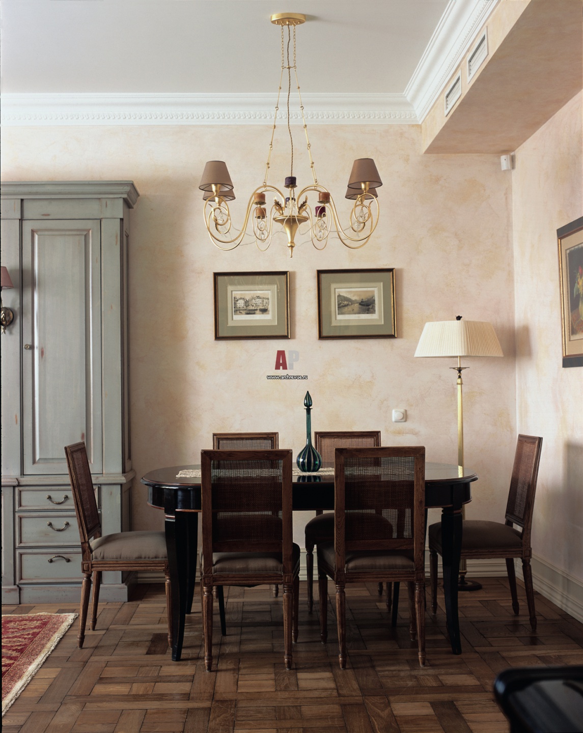 Столовая группа в гостиной. Интерьер столовой исполнен в стиле неоклассика. Потолок украшен лепным карнизом из гипса. На полу – щитовой паркет из брашированного дуба.