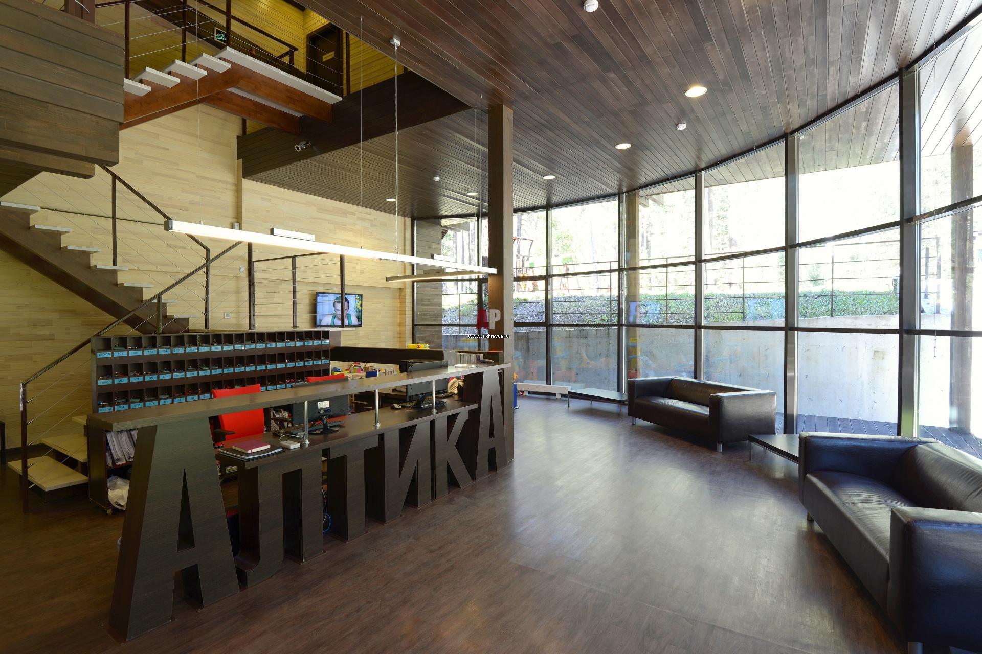 Зона ресепшен расположена в полукруглом панорамном эркере. В дизайне деревянной стойка рецепции читается название отеля.