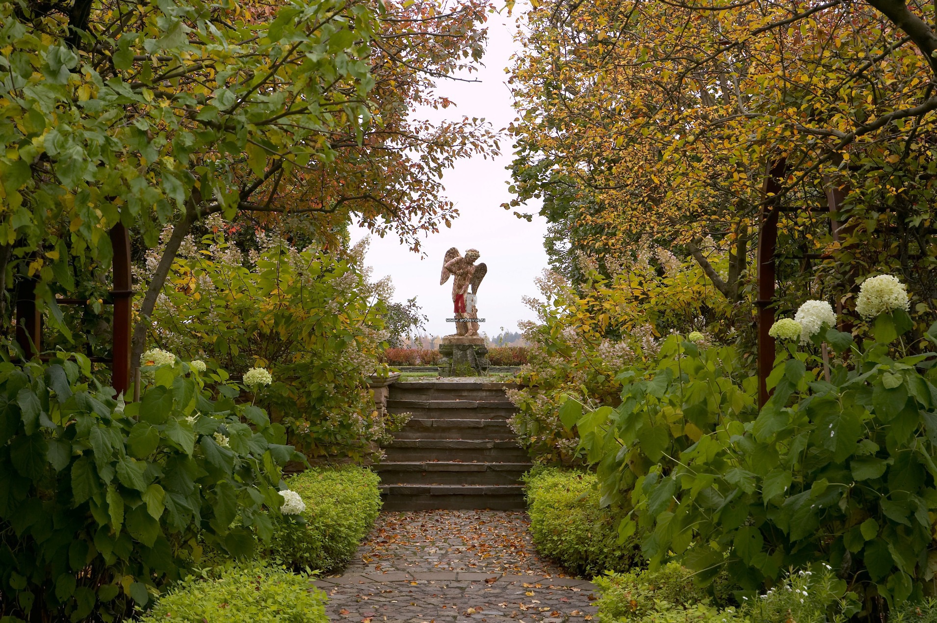 Особенно прекрасен сад осенью. Многообразие красок напоминает палитру художника: красная, желтая, оранжевая листва кленов, лип, и яблонь, ярко-розовые кроны бересклетов и остающиеся вечнозелеными рододендроны и тисы.