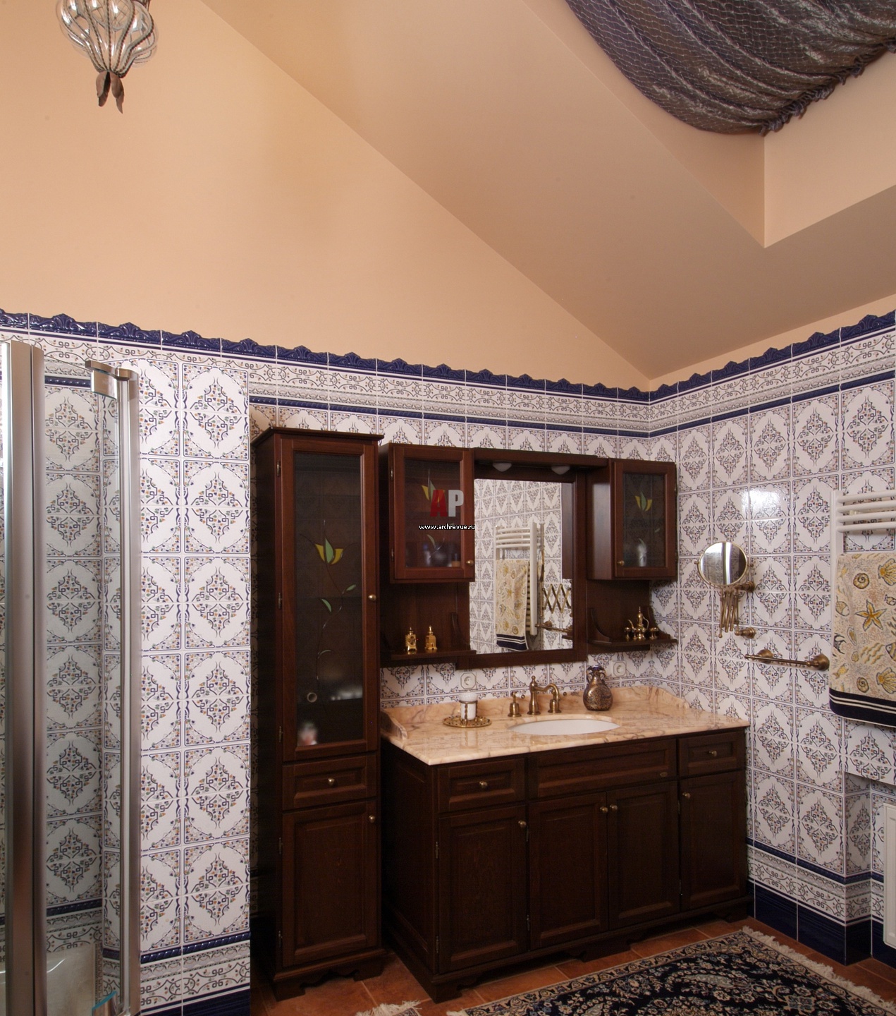 Гостевой санузел выполнен в готическом стиле. Умывальник выполнен из темного дерева, стены облицованы плиткой с ажурным орнаментом, на полах – ковры ручной работы.
