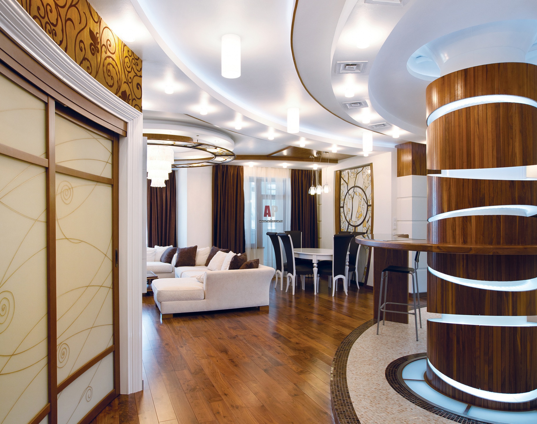 Гостиная объединена со столовой и кухней. Интерьер исполнен в контрастных бежево-шоколадных тонах. На полу – массивная доска ореха фабрики Daino.