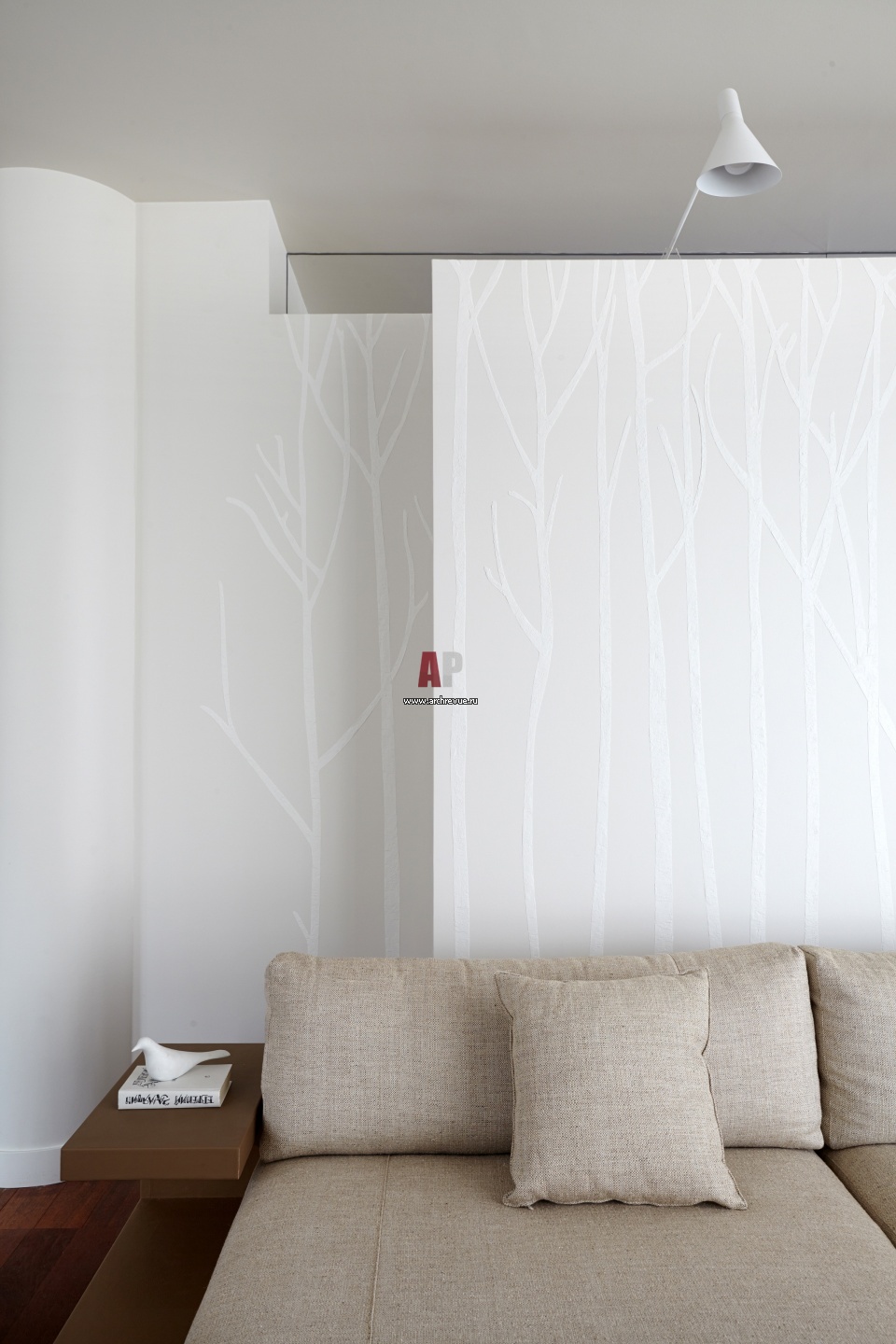 Интерьер спальни исполнен в светлых тонах. Эко-тему поддерживают декоративные финиши с изображением зимнего леса. Сложная пластика стены за изголовьем кровати сформирована полукруглой колонной и несущими элементами. Зеркальный карниз зрительно обогащает пространство и вытягивает его по высоте.