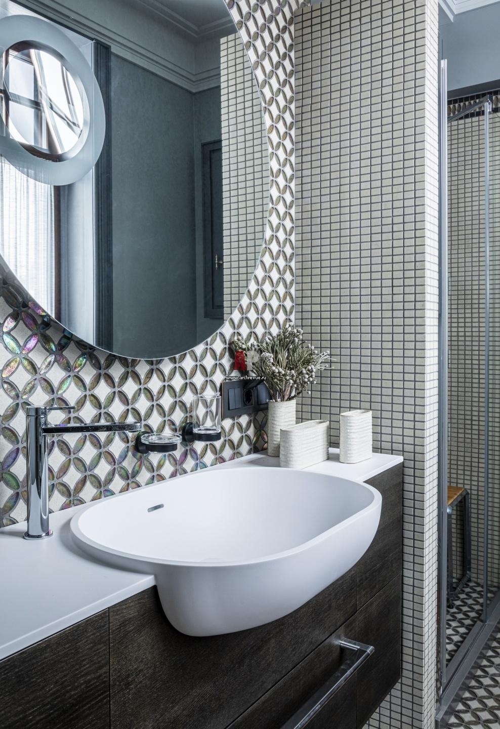 Интерьер гостевого санузла. На стенах и полу – мозаика.