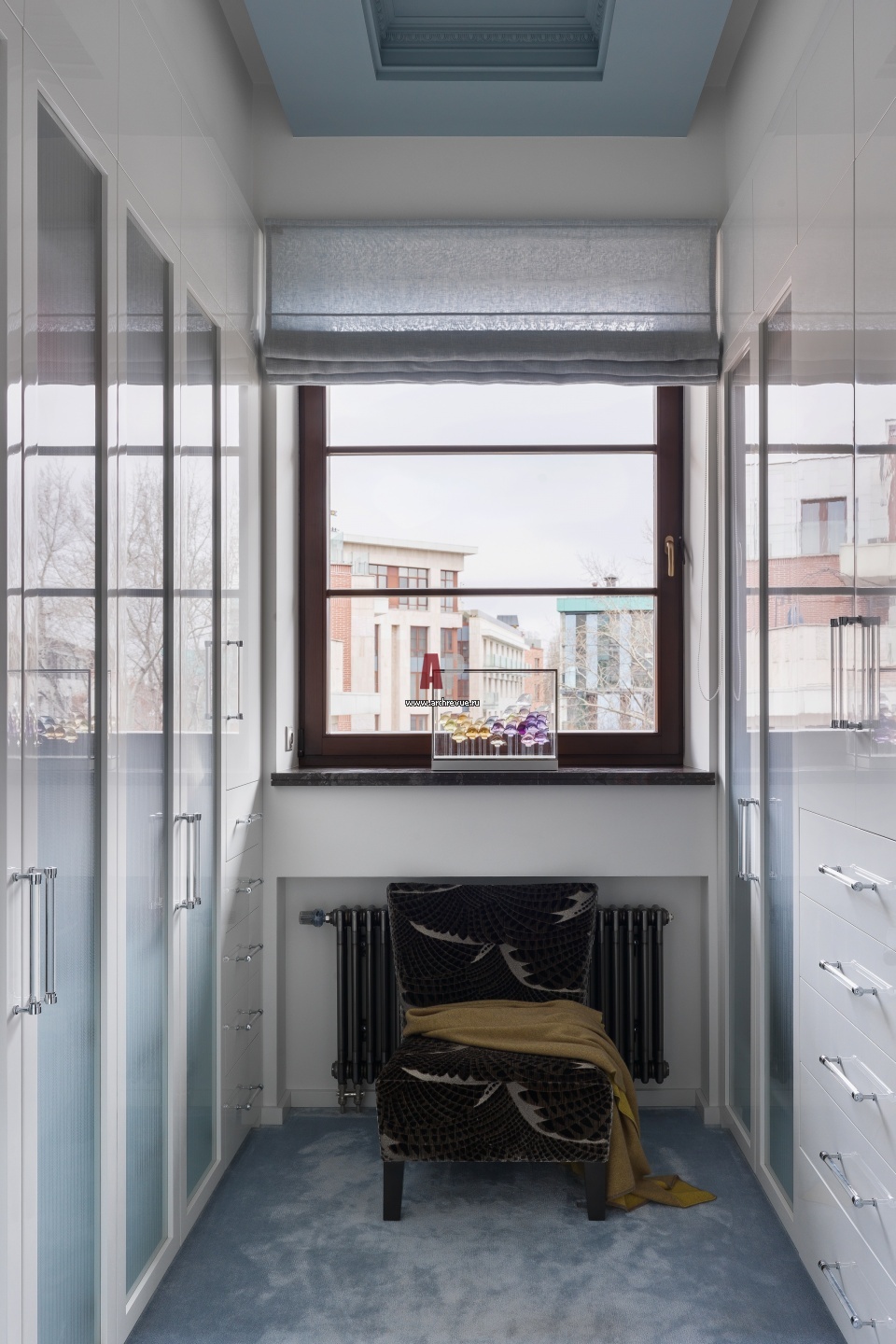 Эклектичная квартира в серебристо-серых тонах. Интерьер изолированной гардеробной комнаты с окном.