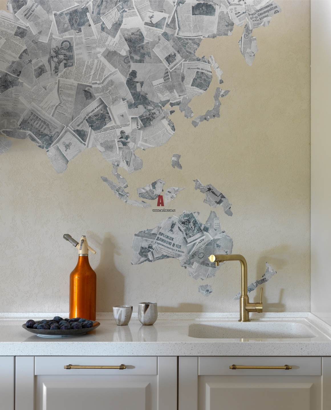 Кухонный фартук превращен в декоративное панно с изображением карты мира. Это стена достижений и побед хозяина дома, который объездил с выступлениями весь мир, многие издания публиковали статьи о нем. Дизайнер распечатала на принтере журнальные материалы, художественно доработала их и наклеила на стену с помощью клея ПВХ. Сверху бумагу покрыла защитным лаком.