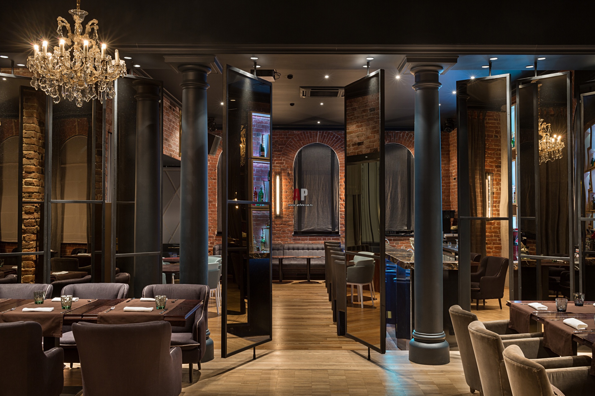 Третий бар располагается в отдельном помещении, оно изолируется от главного зала раздвижной звуконепроницаемой перегородкой и может использоваться как место для проведения мероприятий и банкетов. Помещение состоит из двух зон, их разделяет восемь вращающихся зеркальных ширм.