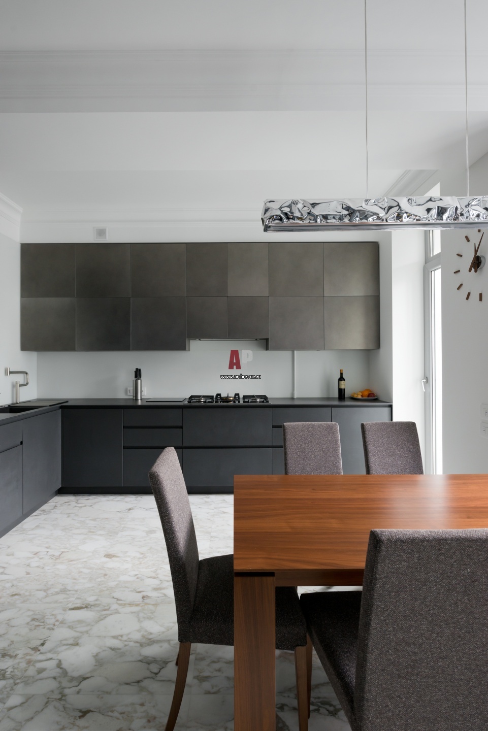 Интерьер кухни-столовой. Светильник, Eichholtz. Кухня, Modulnova. Обеденный стол и стулья, Calligaris.