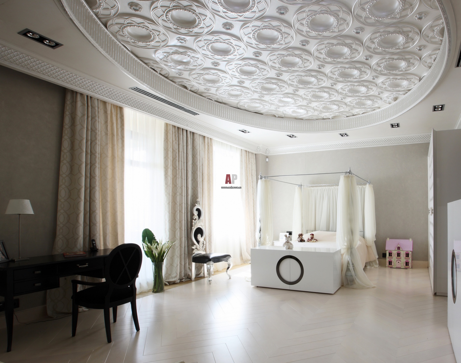 Потолок детской комнаты украшен гипсовыми розетками. Помимо декоративного эффекта они маскируют встроенные светильники. Кровать с балдахином, Cattelan Italia. Тумба, белый глянец, Minotti. Шкаф, Bizzotto. Стул с серебряной спинкой, Rugiano.