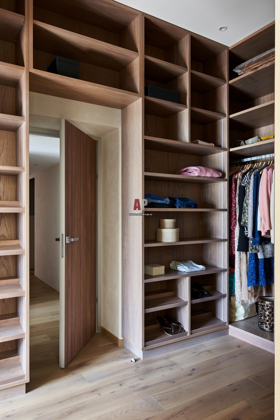 Мебель для гардеробной комнаты сделана на заказ из шпона дуба. Светильники, SLV.