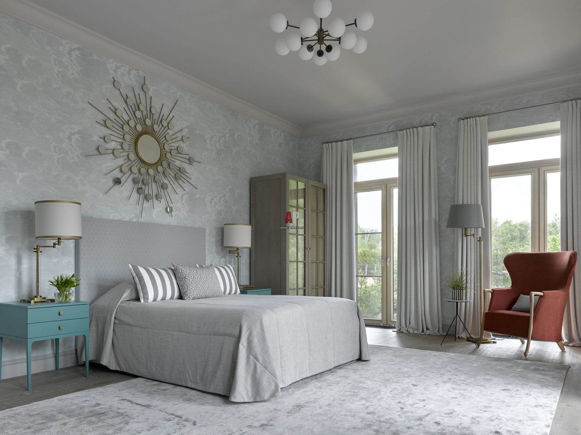 Гостевая спальня в серых тонах. Стены оформлены обоями Fornasetti с рисунком в виде бегущих по небу кучевых облаков. Кровать и прикроватные тумбочки сделаны за заказ. Светильники, Restoration Hardware. Зеркало, Eichholtz. Кресло, Puylaert Home Basics.