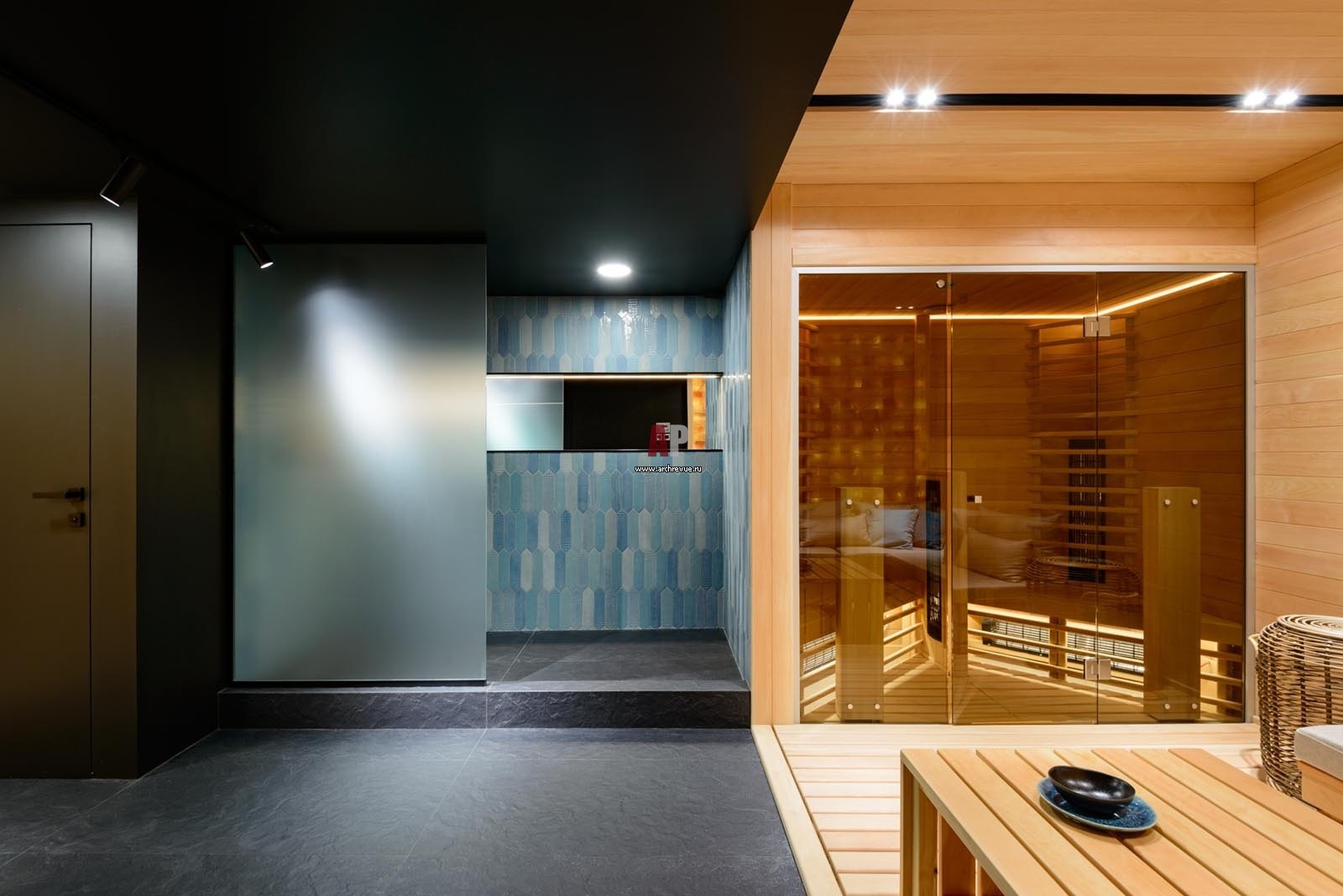 Панорамный дом с минималистскими интерьерами для большой семьи. Сауна в цокольном этаже.