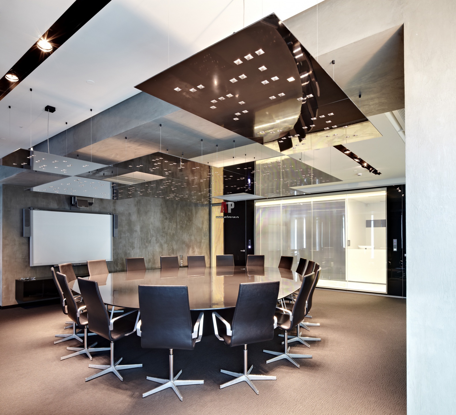 Дизайн главной переговорной исполнен в стиле футуризм. От вестибюля она отделена стеклянными перегородками с изменяющейся прозрачностью. Переговорный стол выполнен на заказ, он напоминает огромный камень, отшлифованный временем. Световая конструкция над столом составлена из нескольких металлических светильников Xal.