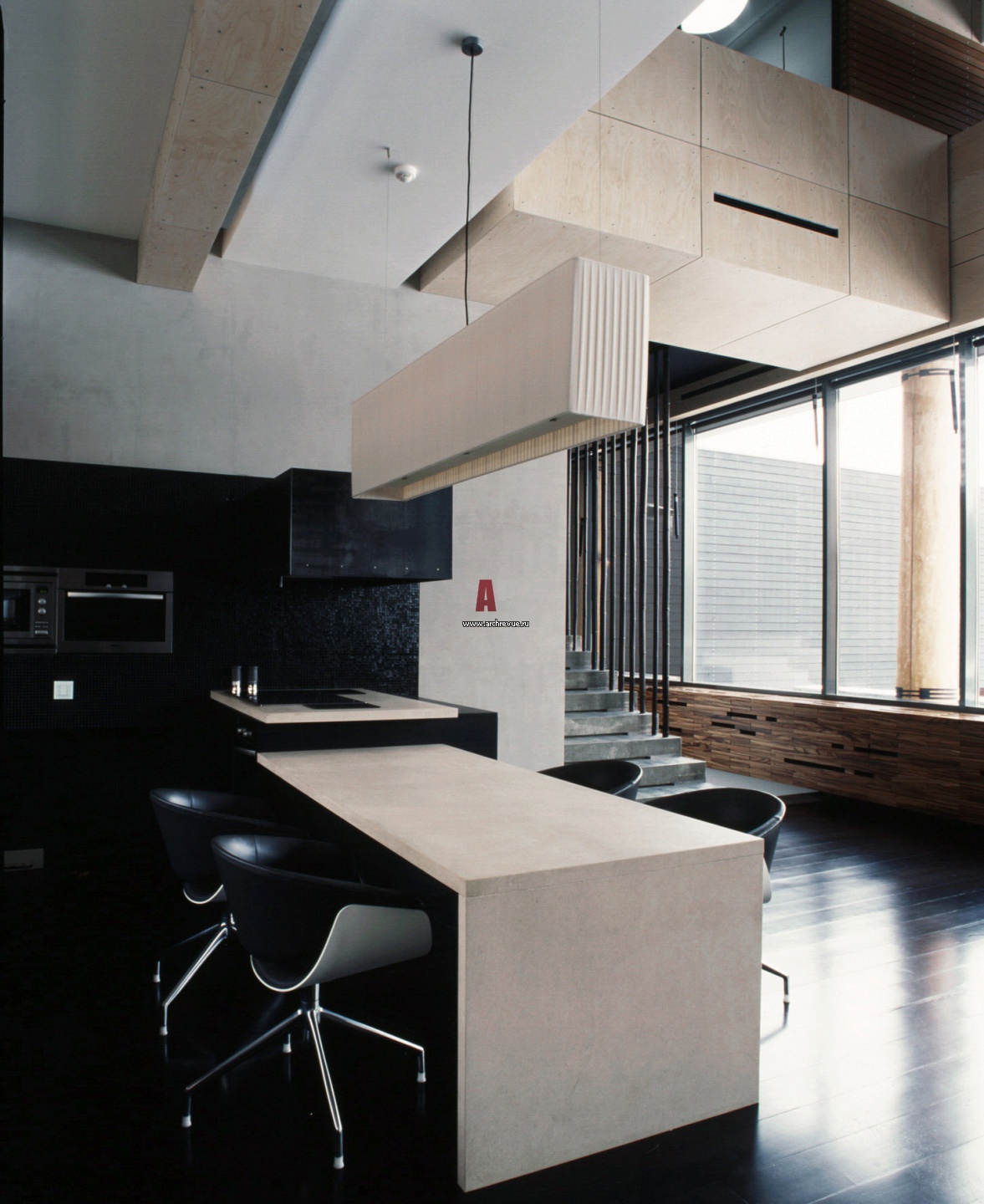 Современная кухня-столовая в общем с гостиной пространстве. Кухонная мебель исполнена в черном цвете. Потолочные балки из светлого дерева.