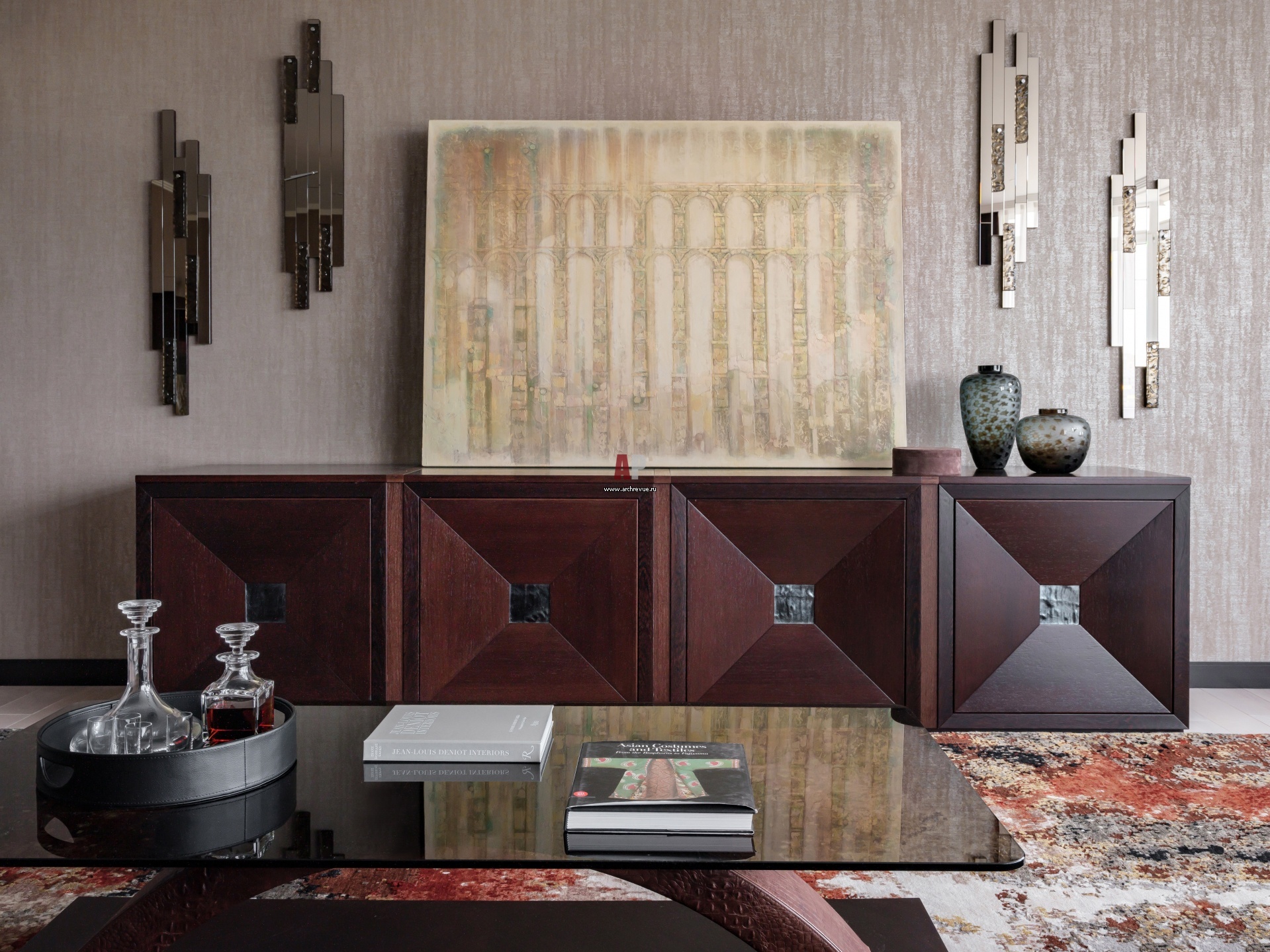 Комод под ТВ в гостиной сделан на заказ из натурального шпона венге со вставками из моллированного стекла. Зеркальный декор на стене также авторская разработка дизайнера Дарьи Пак.