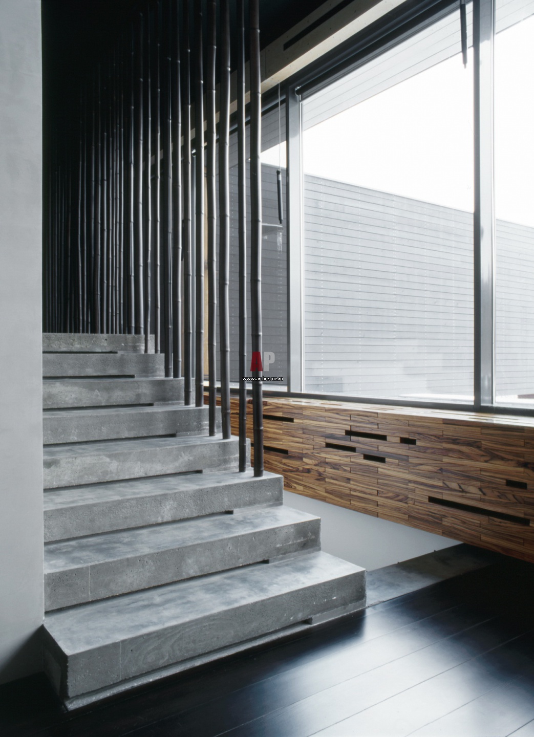 Лестница на третий этаж. Ступени отлиты из бетона. Тросы, имитирующие створы бамбука, металлические.