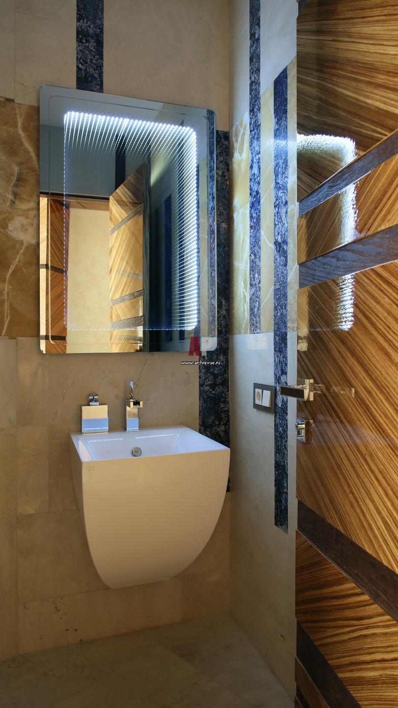 Интерьер санузла в стиле luxury. На стенах – вертикальные вставки из синего гранита.
