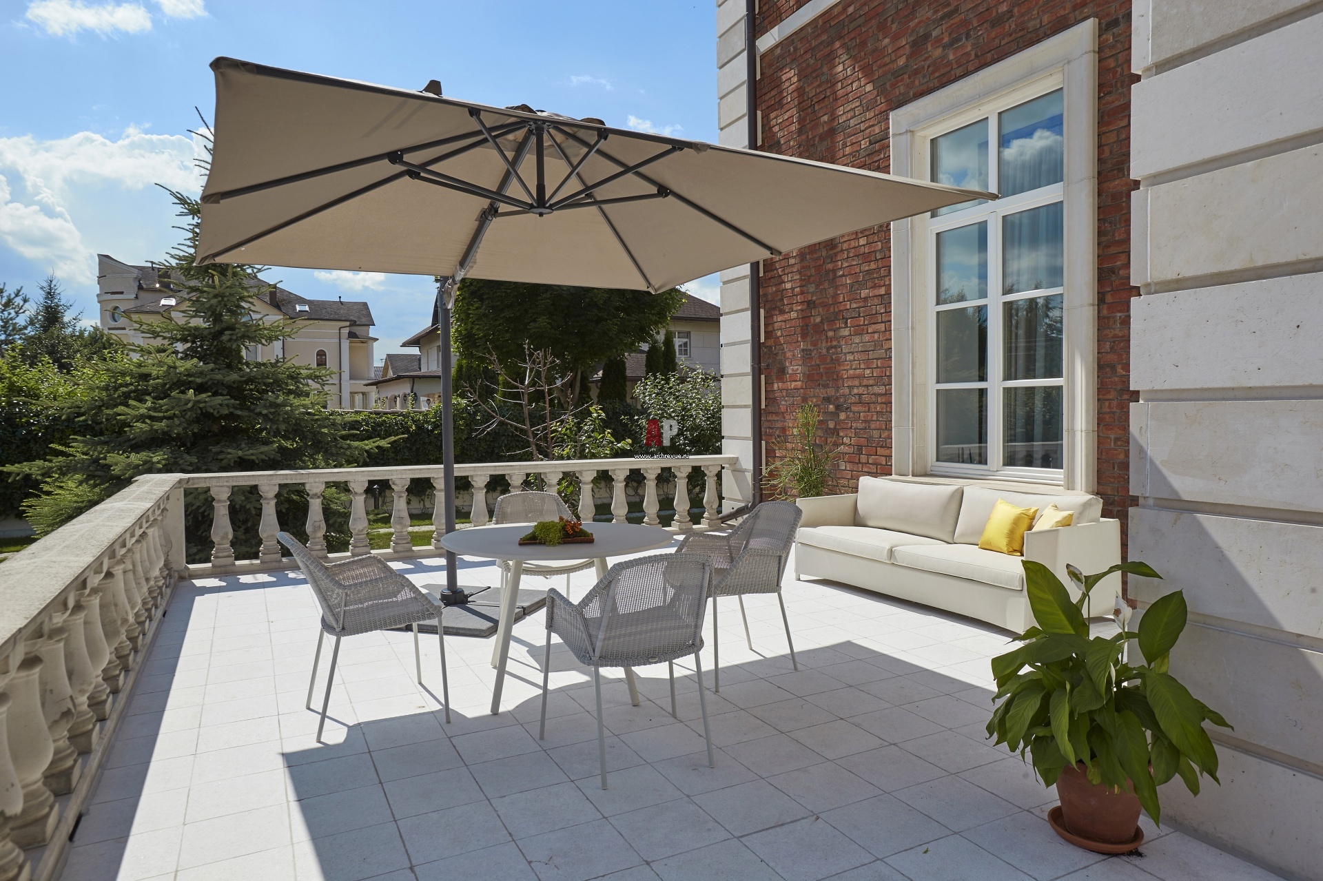 Двухэтажный дом в духе итальянской виллы. Открытая веранда с каменным полом и балюстрадой.